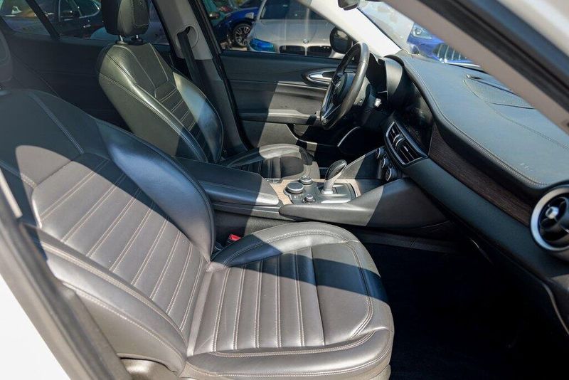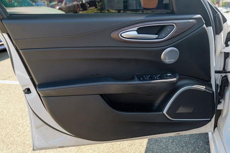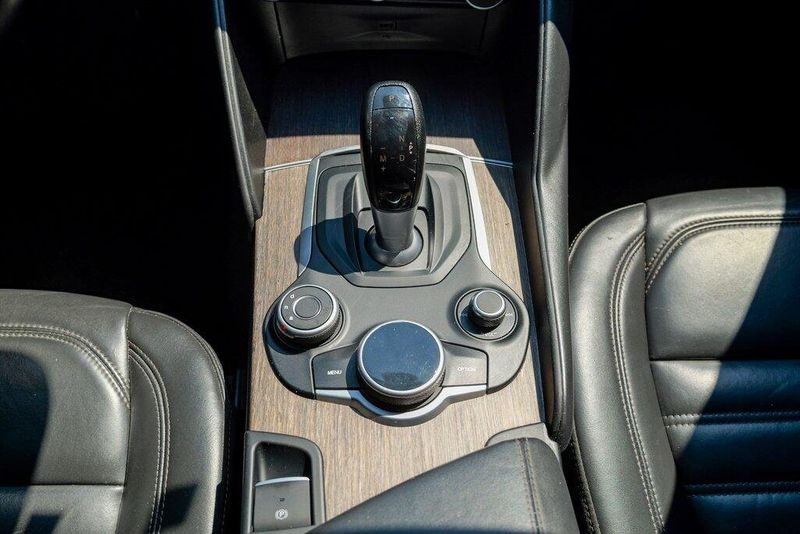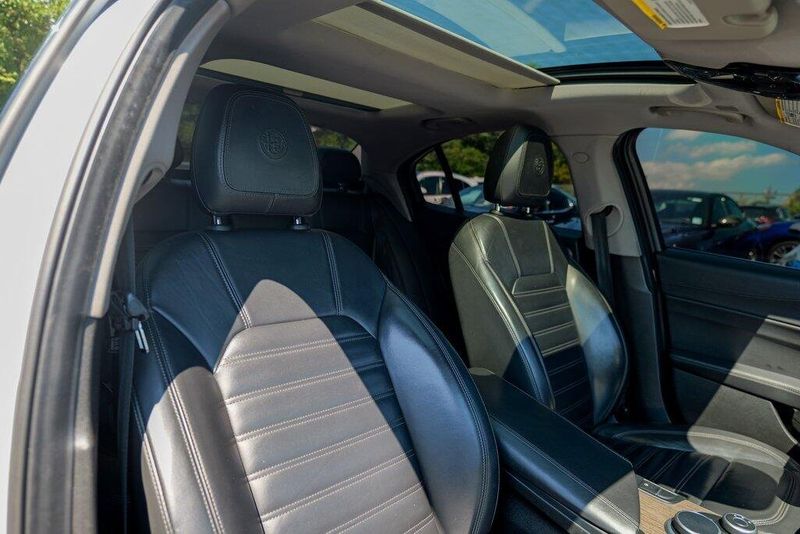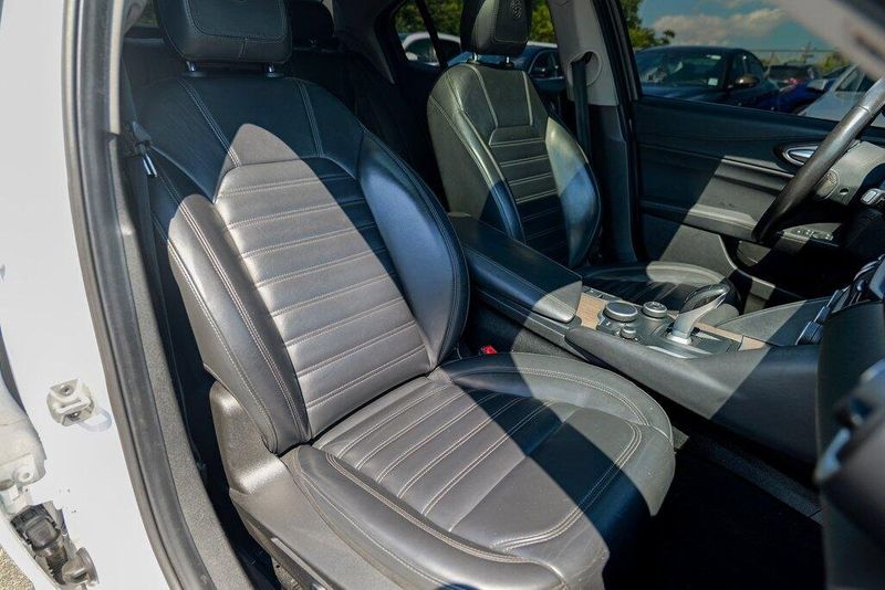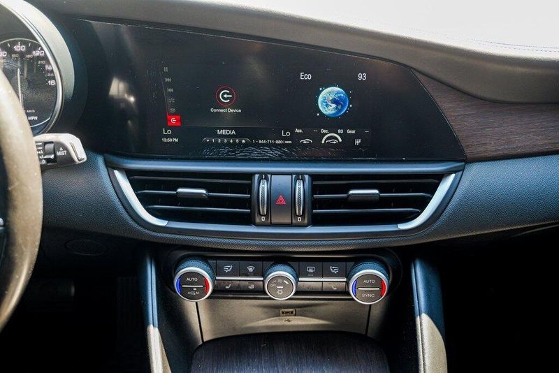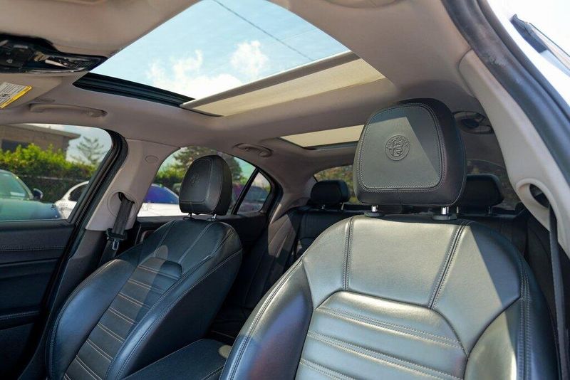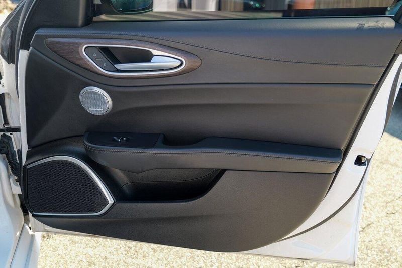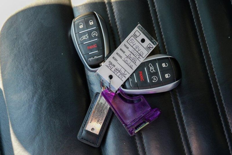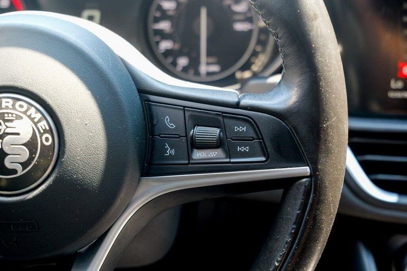 This Giulia Ti is nicely equipped with Driver Assistance Static Package (Auto-Dimming Exterior Mirrors and Blind Spot & Cross Path Detection), Quick Order Package 22G, Ti Lusso Package (DISC) (Air Quality System, Luxury Leather Trimmed Seats, Luxury Steering Wheel, Power Adjust 8-Way Driver Seat, Power Adjust 8-Way Front Passenger Seat, and Wheels: 18'' x 8.0'' Lusso Aluminum), 4-Wheel Disc Brakes, 8 Speakers, 8.8'' Widescreen Color Display, ABS brakes, Air Conditioning, Alloy wheels, AM/FM radio: SiriusXM, Auto-dimming Rear-View mirror, Automatic temperature control, Bluetooth Handsfree Phone & Audio, Brake assist, Bumpers: body-color, Compass, Delay-off headlights, Driver door bin, Driver vanity mirror, Dual front impact airbags, Dual front side impact airbags, Dual-Pane Sunroof, Electronic Stability Control, Exterior Parking Camera Rear, Four wheel independent suspension, Front anti-roll bar, Front Bucket Seats, Front Center Armrest, Front dual zone A/C, Front reading lights, Fully automatic headlights, Garage door transmitter, Genuine wood console insert, Genuine wood dashboard insert, Genuine wood door panel insert, GPS Navigation, harman/kardon Premium Audio, HD Radio, Heated door mirrors, Heated front seats, Heated steering wheel, High intensity discharge headlights: Bi-Xenon, Illuminated entry, Knee airbag, Leather Dash & Upper Doors (DISC), Leather Seats, Leather steering wheel, Low tire pressure warning, Occupant sensing airbag, Outside temperature display, Overhead airbag, Overhead console, Panic alarm, Passenger door bin, Passenger vanity mirror, Power door mirrors, Power driver seat, Power passenger seat, Power steering, Power windows, Radio data system, Radio: AM/FM/HD Bluetooth w/Nav 8.8, Radio: AM/FM/HD w/Bluetooth 8.8, Rain sensing wipers, Rear anti-roll bar, Rear fog lights, Rear reading lights, Rear seat center armrest, Rear window defroster, Remote Audio Controls, Remote keyless entry, Security system, Speed control, Speed-sensing steering, Speed-Sensitive Wipers, Split folding rear seat, Steering wheel mounted audio controls, Tachometer, Telescoping steering wheel, Tilt steering wheel, Traction control, Trip computer, Turn signal indicator mirrors, Variably intermittent wipers, and Wheels: 18'' x 8.0'' Dark Turbine Aluminum.