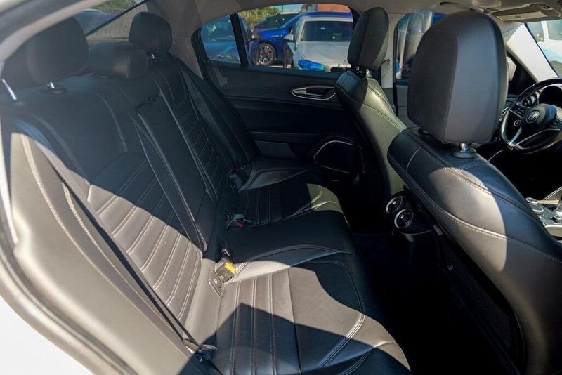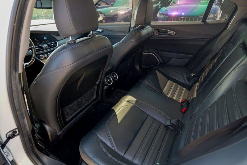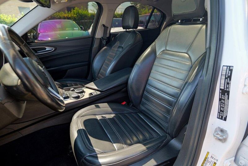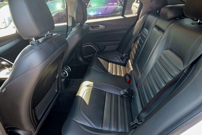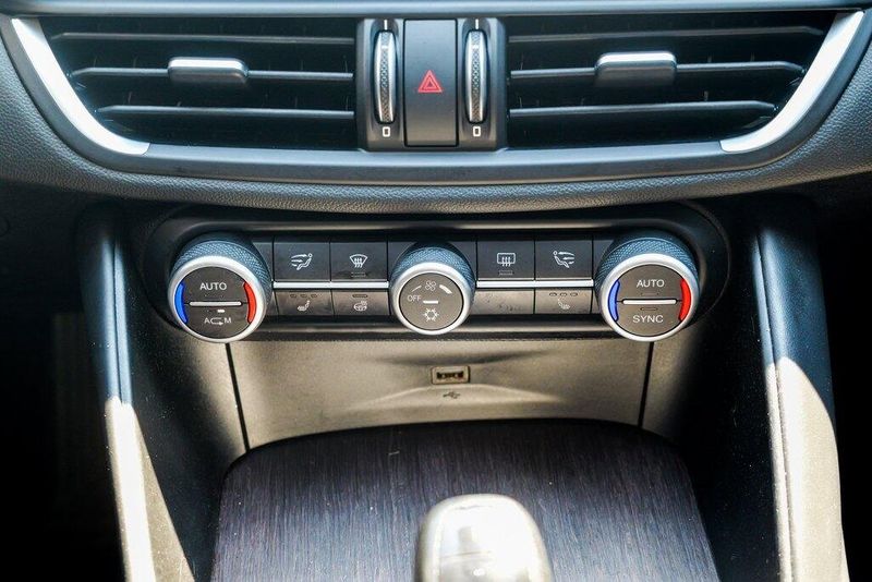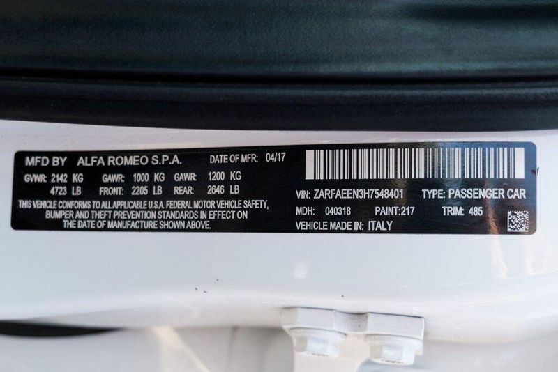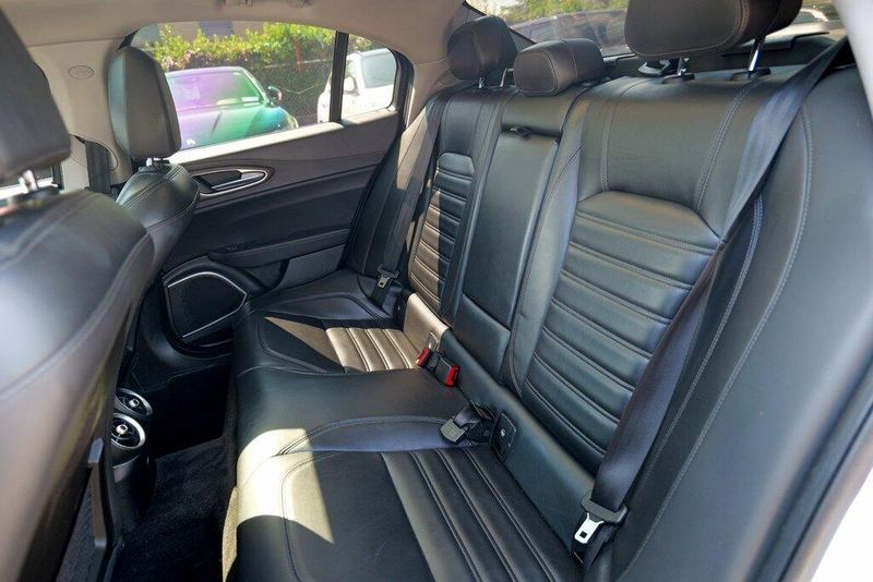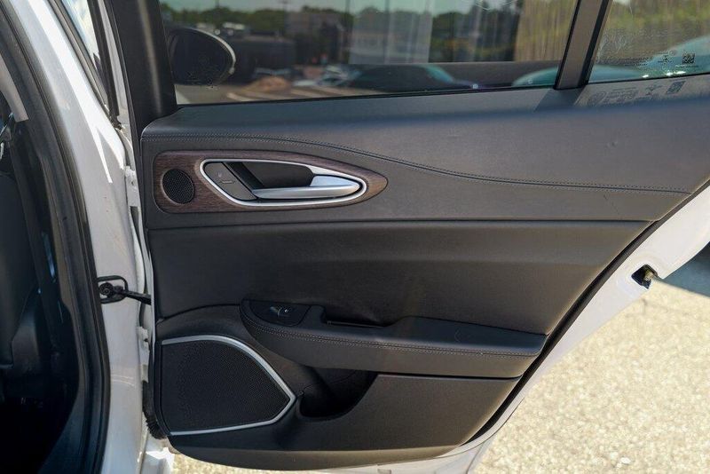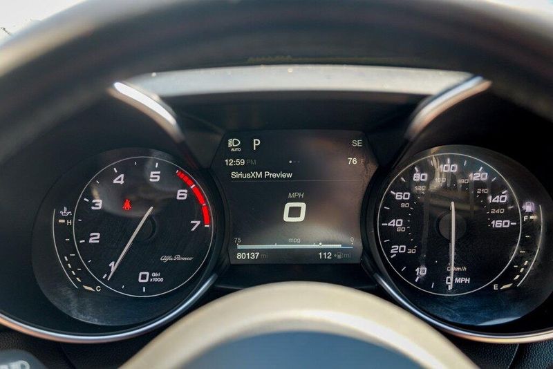 This Giulia Ti is nicely equipped with Driver Assistance Static Package (Auto-Dimming Exterior Mirrors and Blind Spot & Cross Path Detection), Quick Order Package 22G, Ti Lusso Package (DISC) (Air Quality System, Luxury Leather Trimmed Seats, Luxury Steering Wheel, Power Adjust 8-Way Driver Seat, Power Adjust 8-Way Front Passenger Seat, and Wheels: 18'' x 8.0'' Lusso Aluminum), 4-Wheel Disc Brakes, 8 Speakers, 8.8'' Widescreen Color Display, ABS brakes, Air Conditioning, Alloy wheels, AM/FM radio: SiriusXM, Auto-dimming Rear-View mirror, Automatic temperature control, Bluetooth Handsfree Phone & Audio, Brake assist, Bumpers: body-color, Compass, Delay-off headlights, Driver door bin, Driver vanity mirror, Dual front impact airbags, Dual front side impact airbags, Dual-Pane Sunroof, Electronic Stability Control, Exterior Parking Camera Rear, Four wheel independent suspension, Front anti-roll bar, Front Bucket Seats, Front Center Armrest, Front dual zone A/C, Front reading lights, Fully automatic headlights, Garage door transmitter, Genuine wood console insert, Genuine wood dashboard insert, Genuine wood door panel insert, GPS Navigation, harman/kardon Premium Audio, HD Radio, Heated door mirrors, Heated front seats, Heated steering wheel, High intensity discharge headlights: Bi-Xenon, Illuminated entry, Knee airbag, Leather Dash & Upper Doors (DISC), Leather Seats, Leather steering wheel, Low tire pressure warning, Occupant sensing airbag, Outside temperature display, Overhead airbag, Overhead console, Panic alarm, Passenger door bin, Passenger vanity mirror, Power door mirrors, Power driver seat, Power passenger seat, Power steering, Power windows, Radio data system, Radio: AM/FM/HD Bluetooth w/Nav 8.8, Radio: AM/FM/HD w/Bluetooth 8.8, Rain sensing wipers, Rear anti-roll bar, Rear fog lights, Rear reading lights, Rear seat center armrest, Rear window defroster, Remote Audio Controls, Remote keyless entry, Security system, Speed control, Speed-sensing steering, Speed-Sensitive Wipers, Split folding rear seat, Steering wheel mounted audio controls, Tachometer, Telescoping steering wheel, Tilt steering wheel, Traction control, Trip computer, Turn signal indicator mirrors, Variably intermittent wipers, and Wheels: 18'' x 8.0'' Dark Turbine Aluminum.