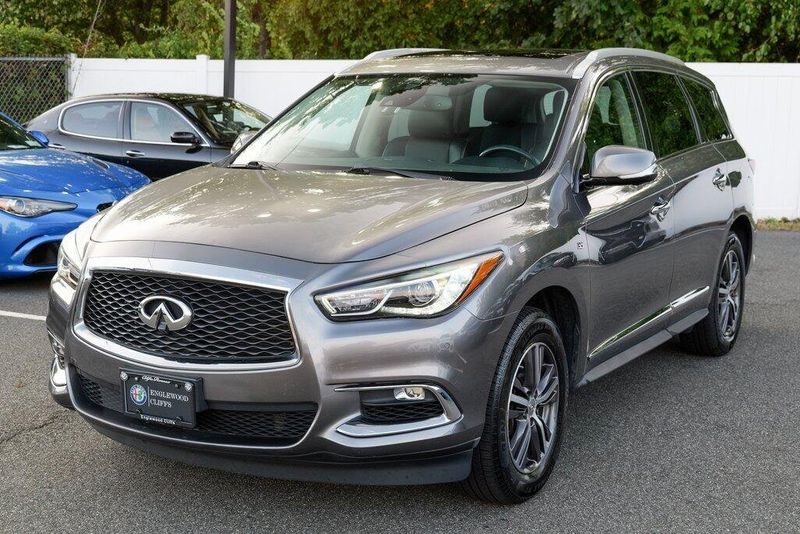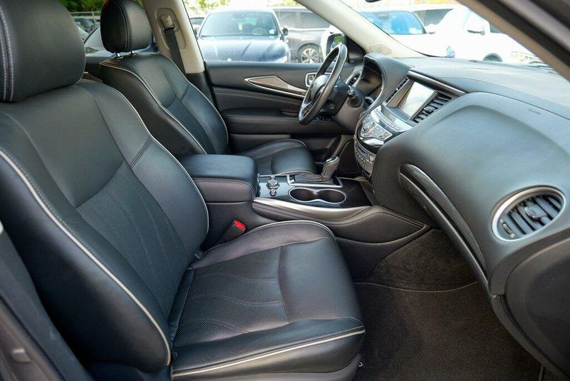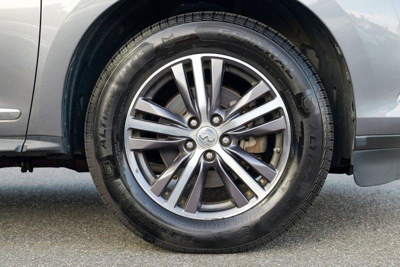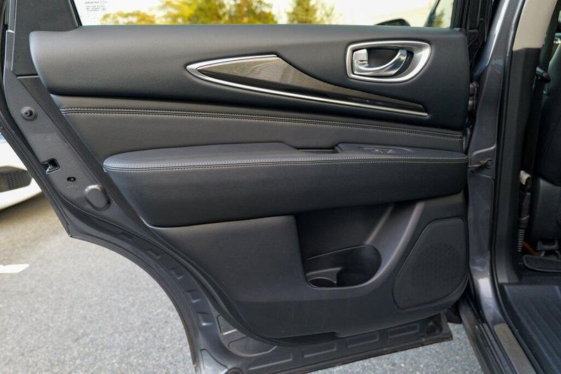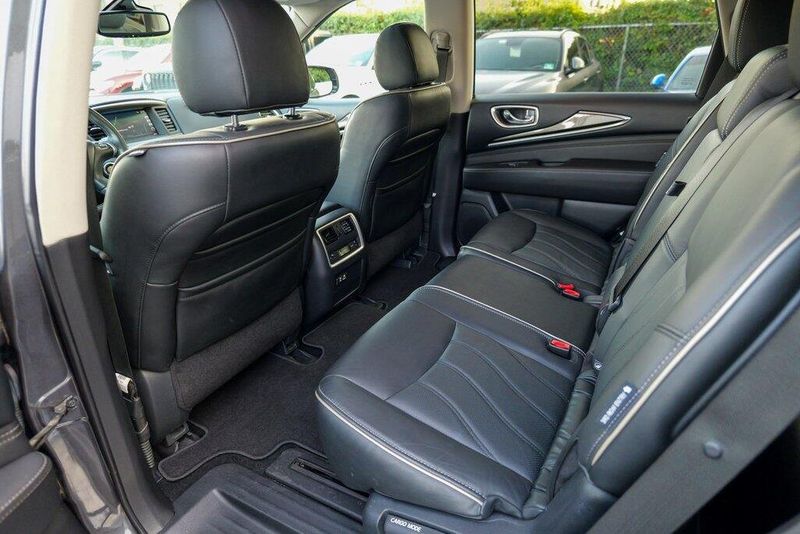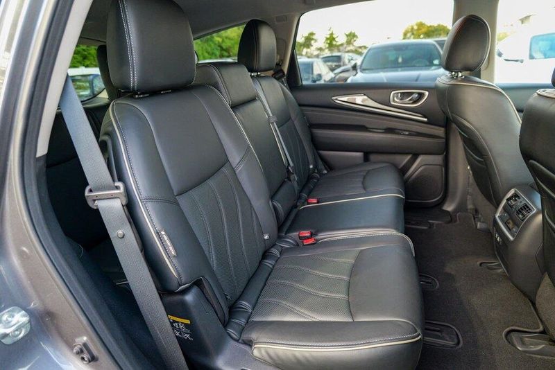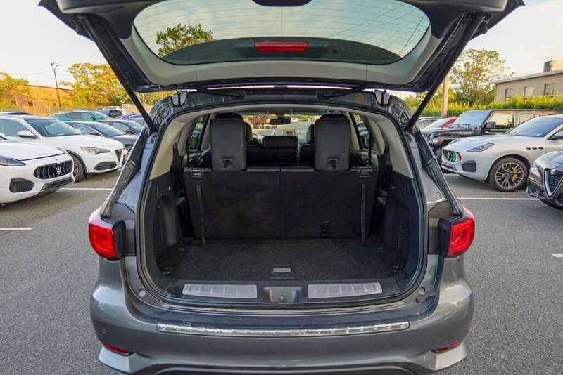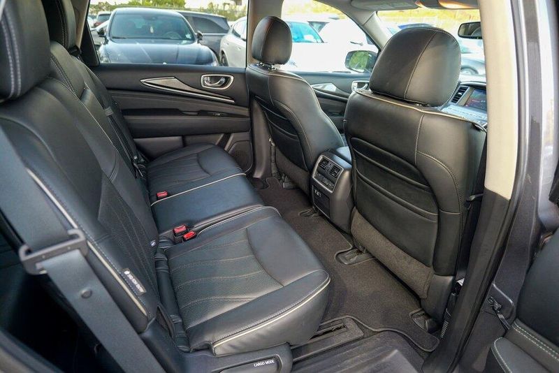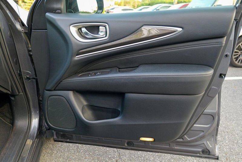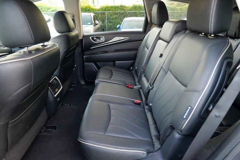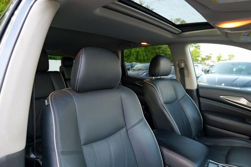 This QX60 LUXE is nicely equipped with Essential Package (Around View Monitor w/Moving Object Detection, Front & Rear Sonar System (2FR/2RR), Illuminated Kick Plates (IKP), INFINITI InTouch w/Navigation & InTouch Services, Leather-Appointed Seat Trim, Rain-Sensing Front Windshield Wipers, and Voice Recognition for Navigation Functions), 13 Speakers, 3rd row seats: bench, 4-Wheel Disc Brakes, 5.25 Axle Ratio, ABS brakes, Air Conditioning, Alloy wheels, AM/FM radio: SiriusXM, Anti-whiplash front head restraints, Auto-dimming Rear-View mirror, Automatic temperature control, Bodyside moldings, Brake assist, Bumpers: body-color, Carpeted Floor Mats (4-Piece Set), CD player, Delay-off headlights, Driver door bin, Driver vanity mirror, Dual front impact airbags, Dual front side impact airbags, DVD-Audio, Electronic Stability Control, Four wheel independent suspension, Front anti-roll bar, Front Bucket Seats, Front Center Armrest w/Storage, Front dual zone A/C, Front fog lights, Front reading lights, Fully automatic headlights, Garage door transmitter: HomeLink, Heated door mirrors, Heated Front Seats, Heated front seats, Heated steering wheel, Illuminated entry, Illuminated Kick Plates (K11), Leather steering wheel, Leatherette Seat Trim, Literature Kit, Low tire pressure warning, Memory seat, Occupant sensing airbag, Outside temperature display, Overhead airbag, Overhead console, Panic alarm, Passenger door bin, Passenger vanity mirror, Power door mirrors, Power driver seat, Power Liftgate, Power moonroof, Power passenger seat, Power steering, Power windows, Radio data system, Radio: AM/FM/CD/DVD w/Bose Premium Audio System, Rear air conditioning, Rear anti-roll bar, Rear Bumper Protector, Rear reading lights, Rear seat center armrest, Rear window defroster, Rear window wiper, Reclining 3rd row seat, Remote keyless entry, Roof rack: rails only, Security system, Speed control, Speed-sensing steering, Speed-Sensitive Wipers, Split folding rear seat, Spoiler, Steering wheel memory, Steering wheel mounted audio controls, Tachometer, Telescoping steering wheel, Tilt steering wheel, Traction control, Trip computer, Turn signal indicator mirrors, Variably intermittent wipers, and Wheels: 18'' Triple 5-Spoke Aluminum-Alloy.