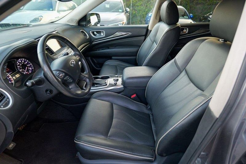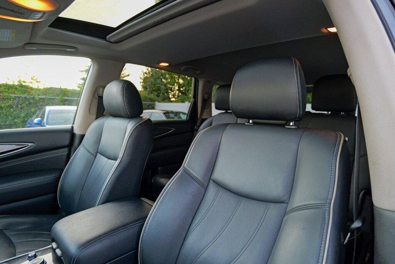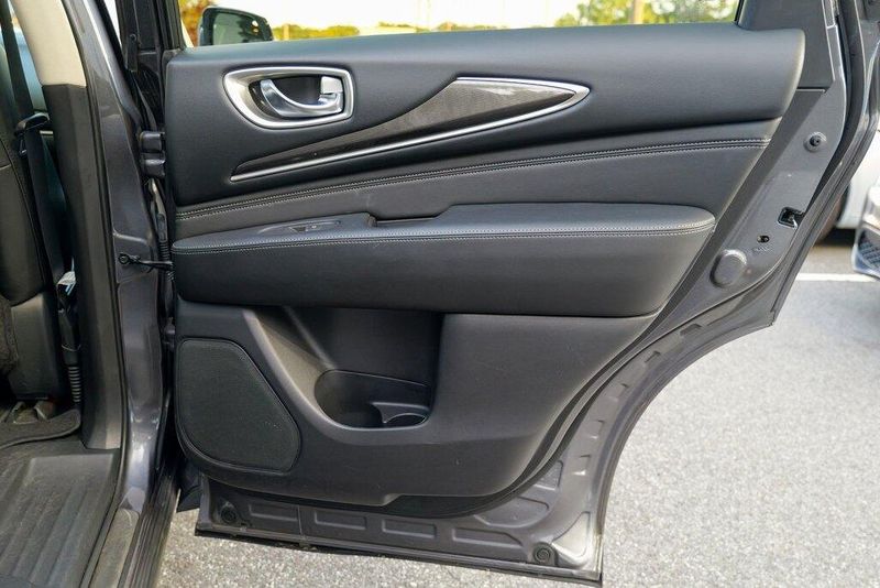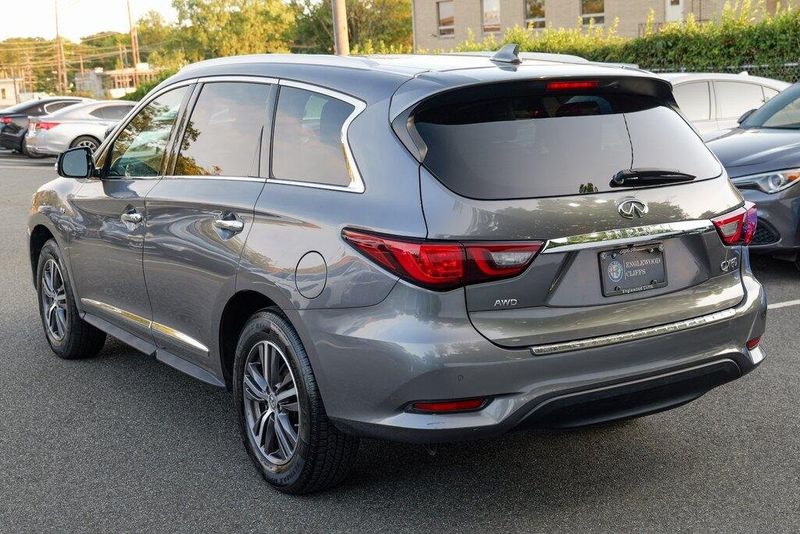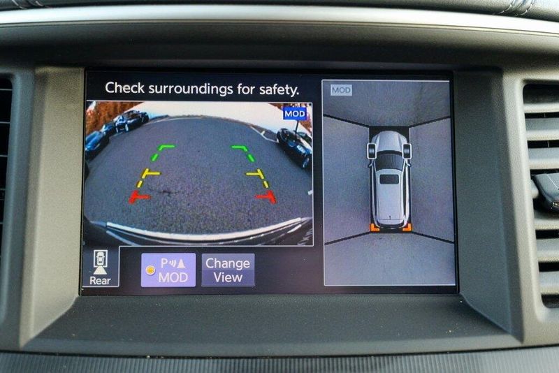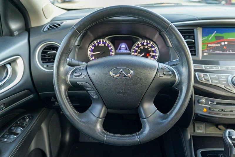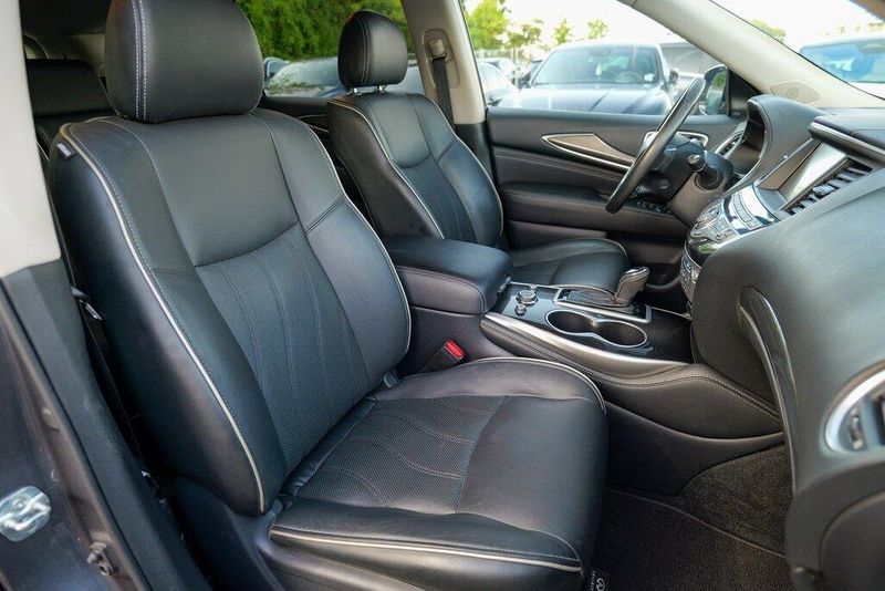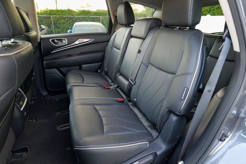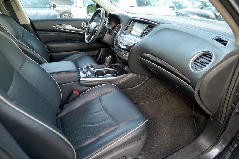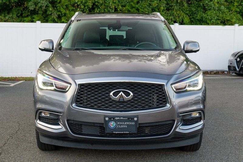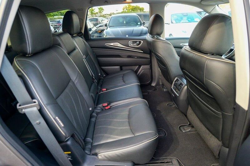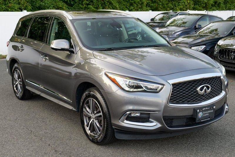 This QX60 LUXE is nicely equipped with Essential Package (Around View Monitor w/Moving Object Detection, Front & Rear Sonar System (2FR/2RR), Illuminated Kick Plates (IKP), INFINITI InTouch w/Navigation & InTouch Services, Leather-Appointed Seat Trim, Rain-Sensing Front Windshield Wipers, and Voice Recognition for Navigation Functions), 13 Speakers, 3rd row seats: bench, 4-Wheel Disc Brakes, 5.25 Axle Ratio, ABS brakes, Air Conditioning, Alloy wheels, AM/FM radio: SiriusXM, Anti-whiplash front head restraints, Auto-dimming Rear-View mirror, Automatic temperature control, Bodyside moldings, Brake assist, Bumpers: body-color, Carpeted Floor Mats (4-Piece Set), CD player, Delay-off headlights, Driver door bin, Driver vanity mirror, Dual front impact airbags, Dual front side impact airbags, DVD-Audio, Electronic Stability Control, Four wheel independent suspension, Front anti-roll bar, Front Bucket Seats, Front Center Armrest w/Storage, Front dual zone A/C, Front fog lights, Front reading lights, Fully automatic headlights, Garage door transmitter: HomeLink, Heated door mirrors, Heated Front Seats, Heated front seats, Heated steering wheel, Illuminated entry, Illuminated Kick Plates (K11), Leather steering wheel, Leatherette Seat Trim, Literature Kit, Low tire pressure warning, Memory seat, Occupant sensing airbag, Outside temperature display, Overhead airbag, Overhead console, Panic alarm, Passenger door bin, Passenger vanity mirror, Power door mirrors, Power driver seat, Power Liftgate, Power moonroof, Power passenger seat, Power steering, Power windows, Radio data system, Radio: AM/FM/CD/DVD w/Bose Premium Audio System, Rear air conditioning, Rear anti-roll bar, Rear Bumper Protector, Rear reading lights, Rear seat center armrest, Rear window defroster, Rear window wiper, Reclining 3rd row seat, Remote keyless entry, Roof rack: rails only, Security system, Speed control, Speed-sensing steering, Speed-Sensitive Wipers, Split folding rear seat, Spoiler, Steering wheel memory, Steering wheel mounted audio controls, Tachometer, Telescoping steering wheel, Tilt steering wheel, Traction control, Trip computer, Turn signal indicator mirrors, Variably intermittent wipers, and Wheels: 18'' Triple 5-Spoke Aluminum-Alloy.