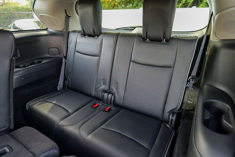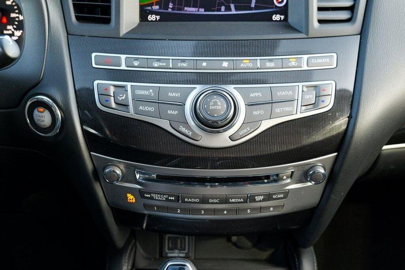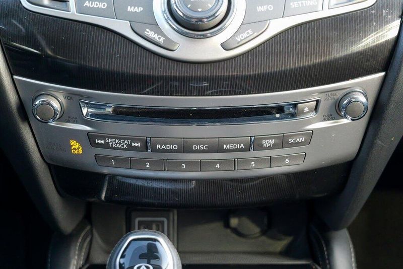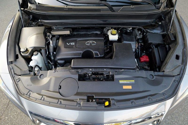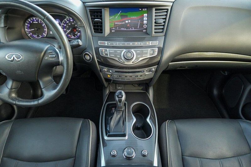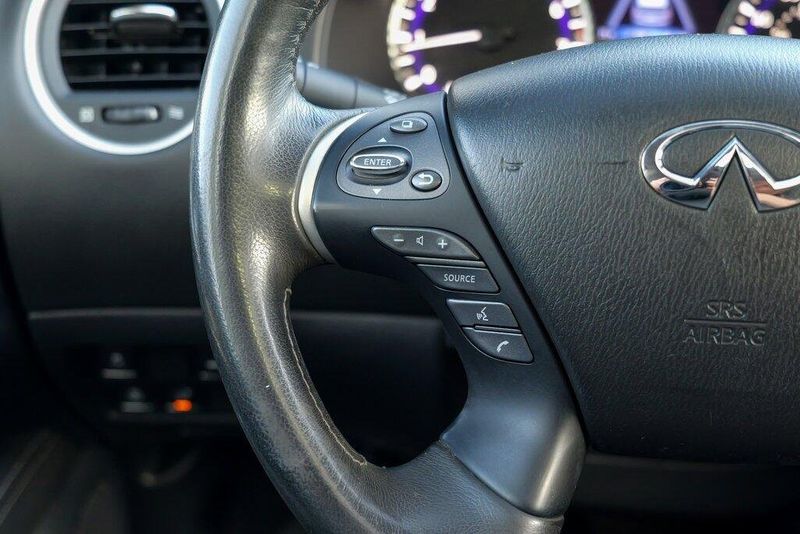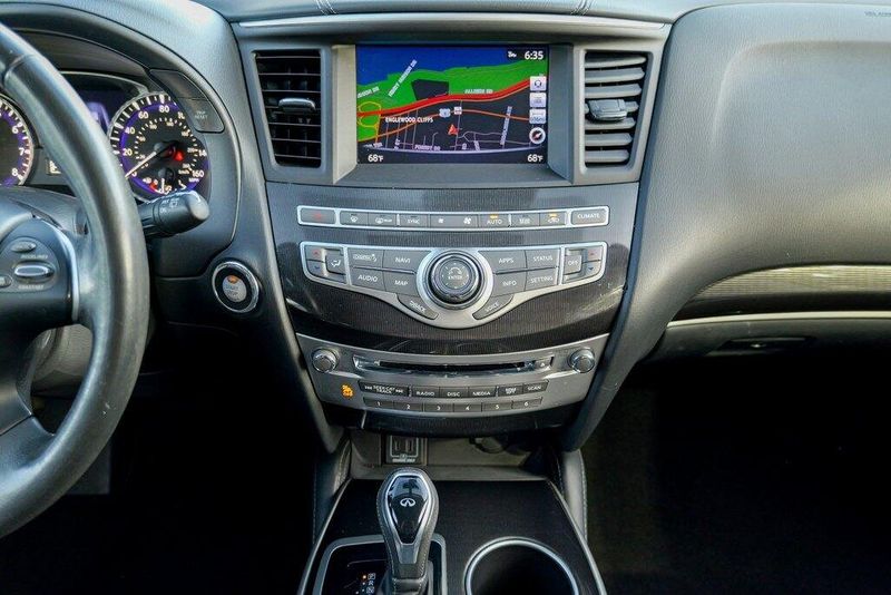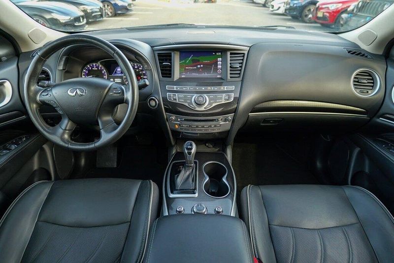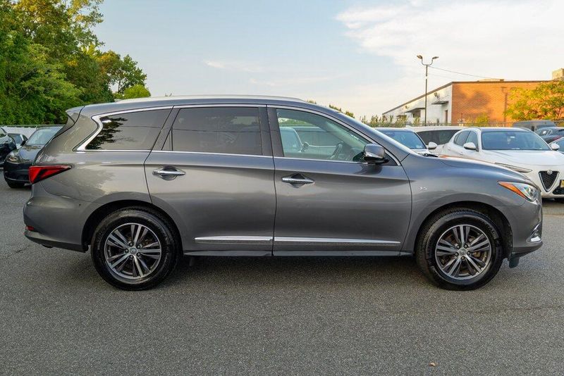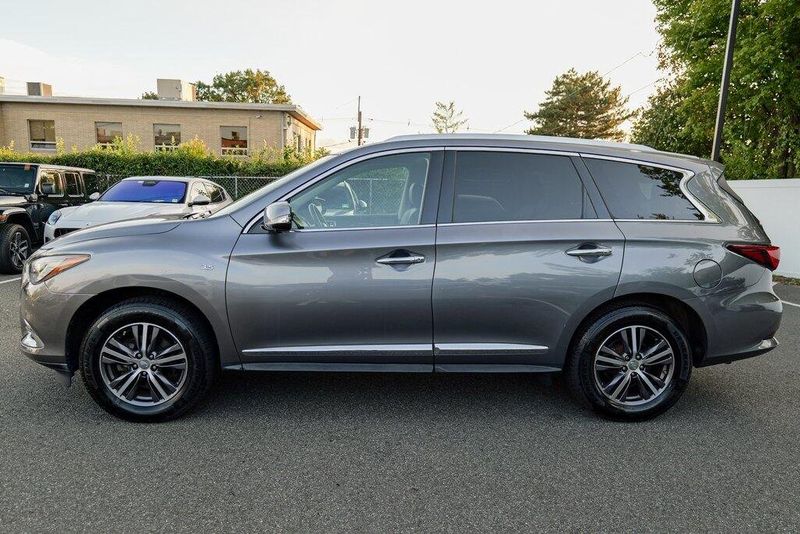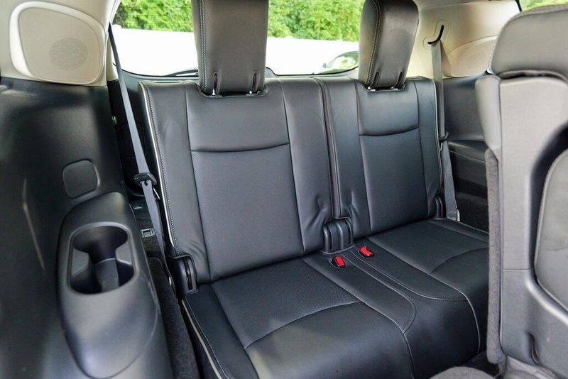 This QX60 LUXE is nicely equipped with Essential Package (Around View Monitor w/Moving Object Detection, Front & Rear Sonar System (2FR/2RR), Illuminated Kick Plates (IKP), INFINITI InTouch w/Navigation & InTouch Services, Leather-Appointed Seat Trim, Rain-Sensing Front Windshield Wipers, and Voice Recognition for Navigation Functions), 13 Speakers, 3rd row seats: bench, 4-Wheel Disc Brakes, 5.25 Axle Ratio, ABS brakes, Air Conditioning, Alloy wheels, AM/FM radio: SiriusXM, Anti-whiplash front head restraints, Auto-dimming Rear-View mirror, Automatic temperature control, Bodyside moldings, Brake assist, Bumpers: body-color, Carpeted Floor Mats (4-Piece Set), CD player, Delay-off headlights, Driver door bin, Driver vanity mirror, Dual front impact airbags, Dual front side impact airbags, DVD-Audio, Electronic Stability Control, Four wheel independent suspension, Front anti-roll bar, Front Bucket Seats, Front Center Armrest w/Storage, Front dual zone A/C, Front fog lights, Front reading lights, Fully automatic headlights, Garage door transmitter: HomeLink, Heated door mirrors, Heated Front Seats, Heated front seats, Heated steering wheel, Illuminated entry, Illuminated Kick Plates (K11), Leather steering wheel, Leatherette Seat Trim, Literature Kit, Low tire pressure warning, Memory seat, Occupant sensing airbag, Outside temperature display, Overhead airbag, Overhead console, Panic alarm, Passenger door bin, Passenger vanity mirror, Power door mirrors, Power driver seat, Power Liftgate, Power moonroof, Power passenger seat, Power steering, Power windows, Radio data system, Radio: AM/FM/CD/DVD w/Bose Premium Audio System, Rear air conditioning, Rear anti-roll bar, Rear Bumper Protector, Rear reading lights, Rear seat center armrest, Rear window defroster, Rear window wiper, Reclining 3rd row seat, Remote keyless entry, Roof rack: rails only, Security system, Speed control, Speed-sensing steering, Speed-Sensitive Wipers, Split folding rear seat, Spoiler, Steering wheel memory, Steering wheel mounted audio controls, Tachometer, Telescoping steering wheel, Tilt steering wheel, Traction control, Trip computer, Turn signal indicator mirrors, Variably intermittent wipers, and Wheels: 18'' Triple 5-Spoke Aluminum-Alloy.
