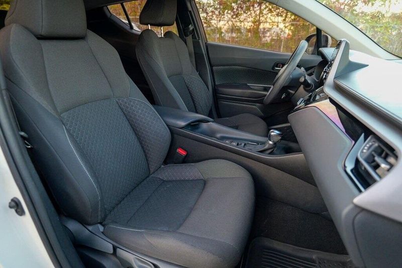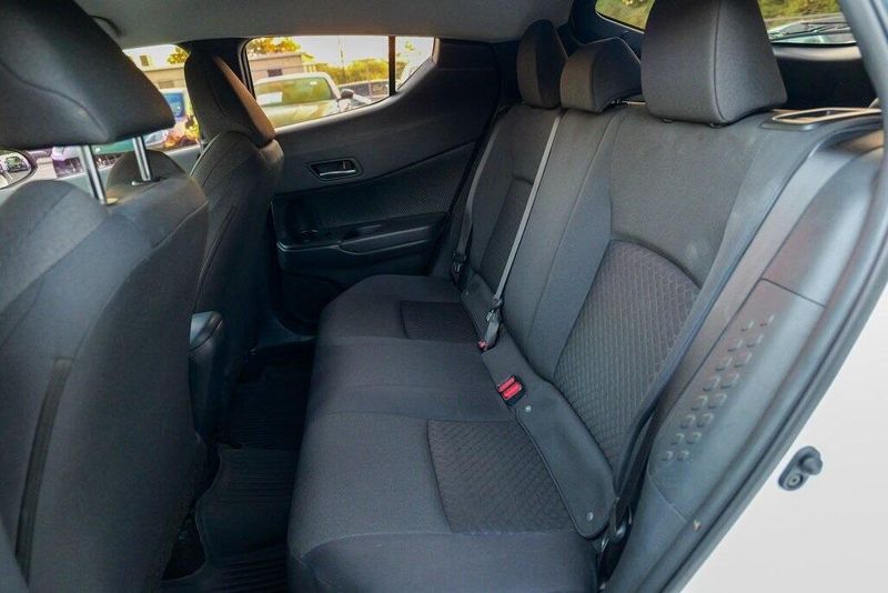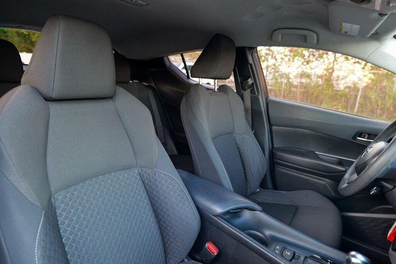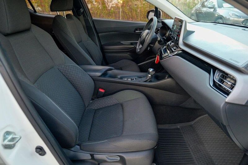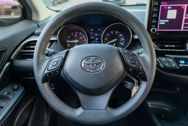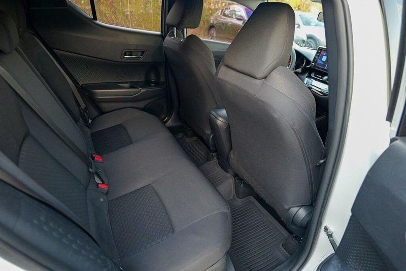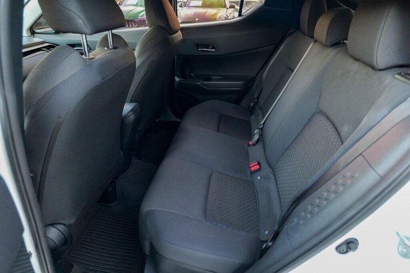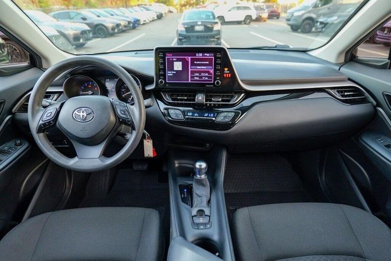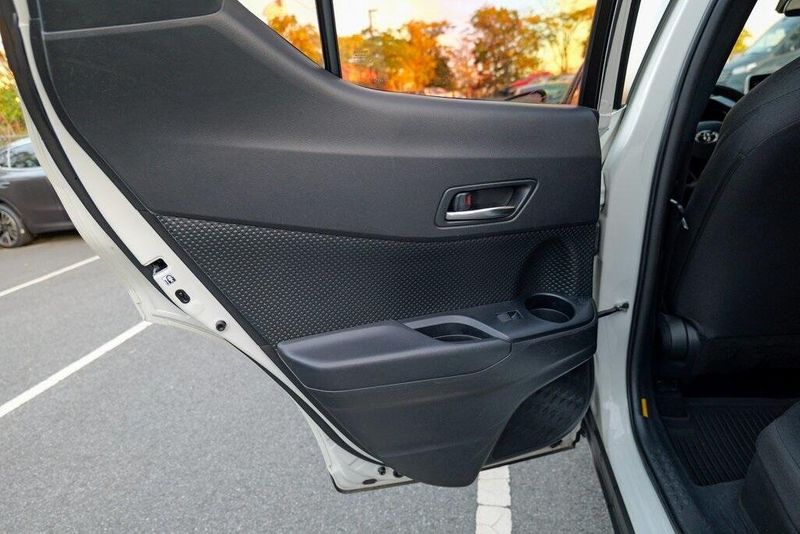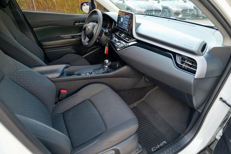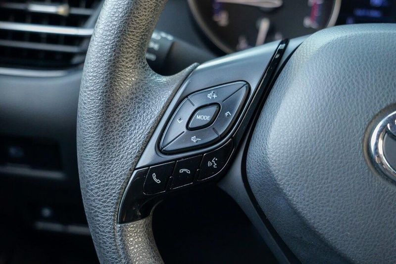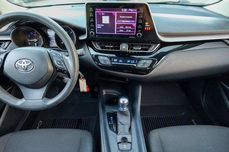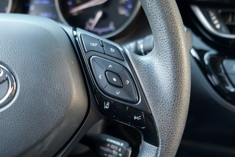 This C-HR LE is nicely equipped with 4-Wheel Disc Brakes, 6 Speakers, ABS brakes, Air Conditioning, AM/FM radio: SiriusXM, Apple CarPlay/Android Auto, Auto High-beam Headlights, Auto-dimming Rear-View mirror, Automatic temperature control, Axle Ratio: TBD, Brake assist, Bumpers: body-color, Delay-off headlights, Driver door bin, Driver vanity mirror, Dual front impact airbags, Dual front side impact airbags, Electronic Stability Control, Emergency communication system: Safety Connect with 1-year trial, Exterior Parking Camera Rear, Fabric Seat Material, Four wheel independent suspension, Front anti-roll bar, Front Bucket Seats, Front Center Armrest, Front dual zone A/C, Front reading lights, Fully automatic headlights, Heated door mirrors, Illuminated entry, Knee airbag, Leather Shift Knob, Low tire pressure warning, Occupant sensing airbag, Outside temperature display, Overhead airbag, Panic alarm, Passenger door bin, Passenger vanity mirror, Power door mirrors, Power steering, Power windows, Radio data system, Radio: AM/FM Stereo w/8'' Touch-Screen Display, Rear anti-roll bar, Rear side impact airbag, Rear window defroster, Rear window wiper, Remote keyless entry, Speed control, Speed-sensing steering, Split folding rear seat, Spoiler, Steering wheel mounted audio controls, Tachometer, Telescoping steering wheel, Tilt steering wheel, Traction control, Trip computer, Turn signal indicator mirrors, Variably intermittent wipers, and Wheels: 6.5'' x 17'' Steel.