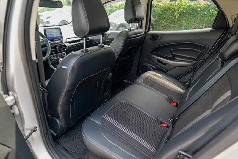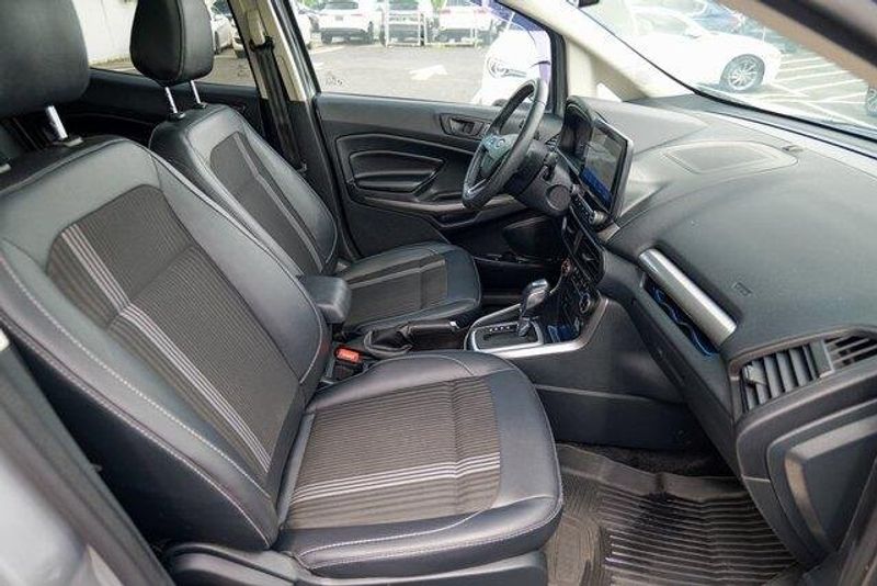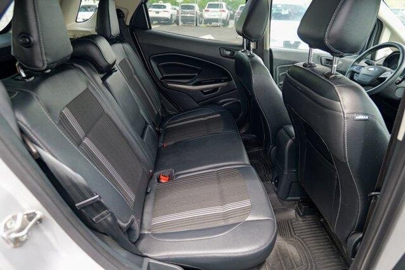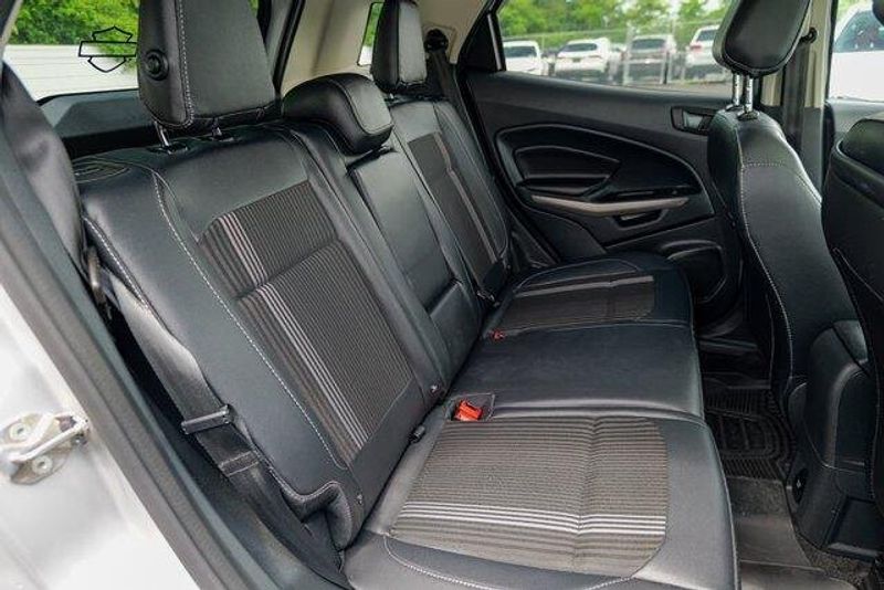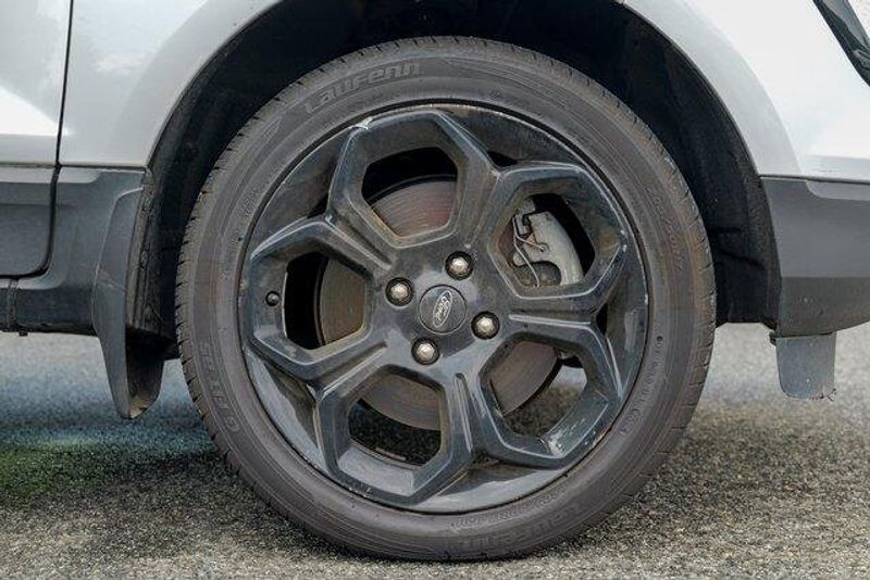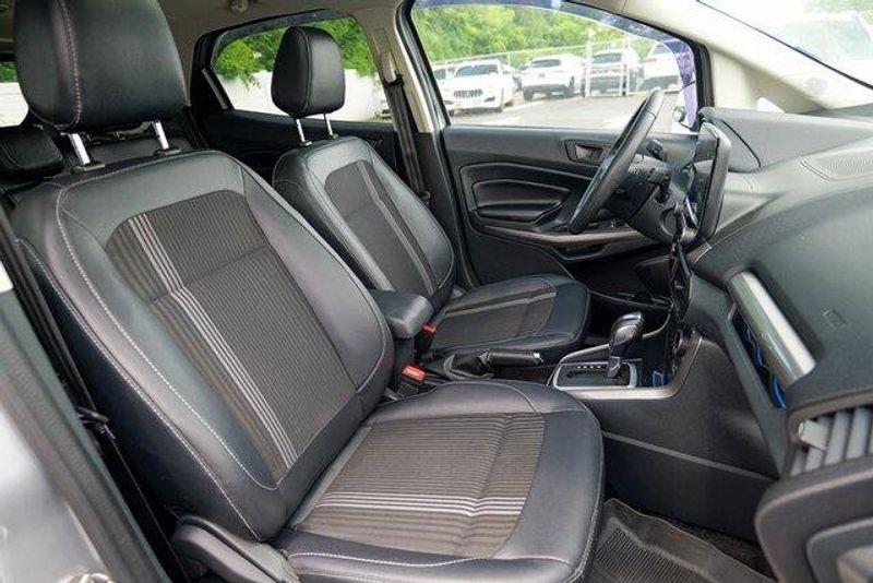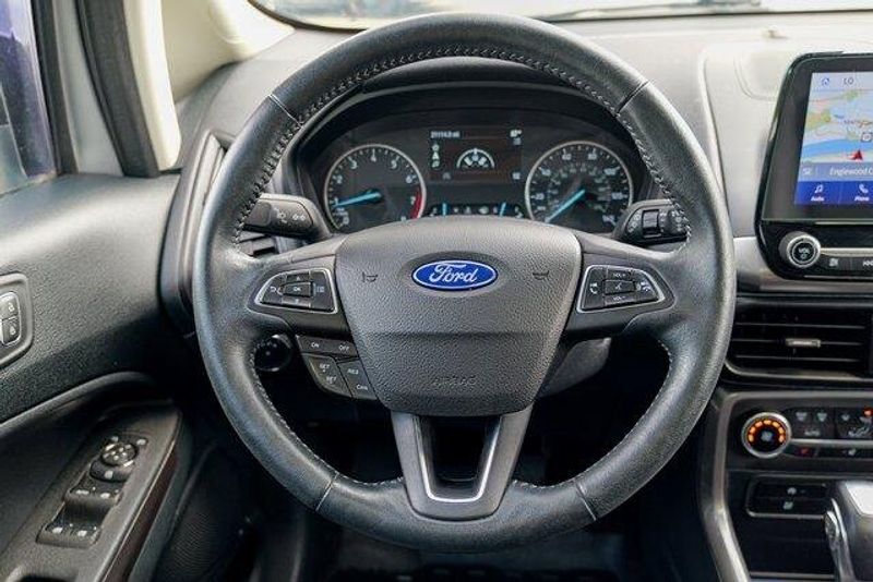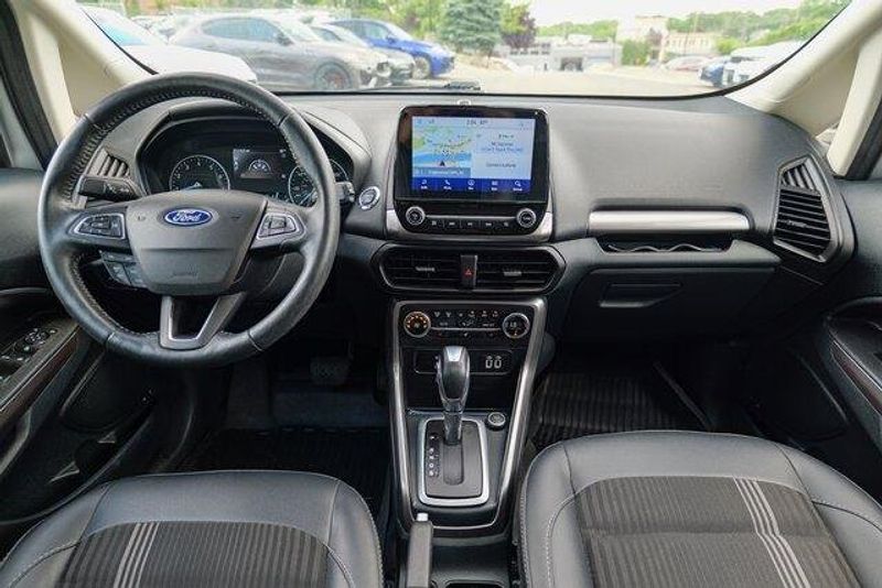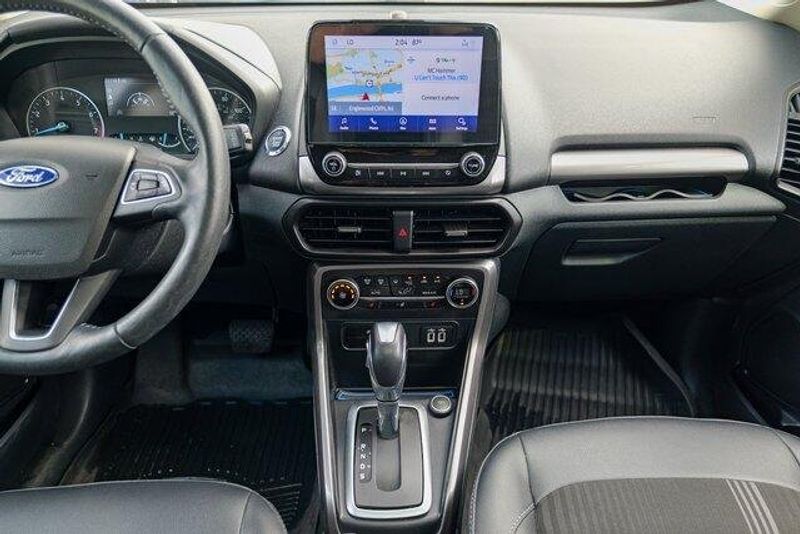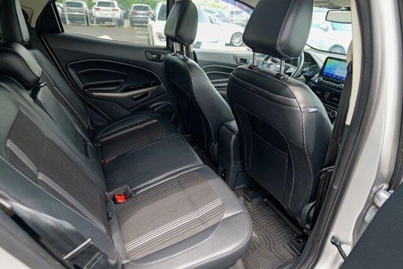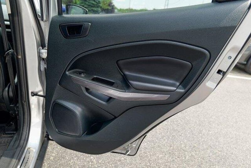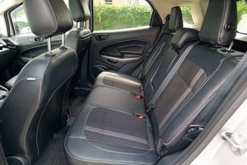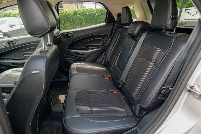 This EcoSport SES is nicely equipped with Equipment Group 300A, 3.51 Axle Ratio, 4-Wheel Disc Brakes, 7 Speakers, ABS brakes, ActiveX Seating Material Heated Front Bucket Seats, Air Conditioning, Alloy wheels, AM/FM radio: SiriusXM, AppLink/Apple CarPlay and Android Auto, Auto-dimming Rear-View mirror, Automatic temperature control, Brake assist, Bumpers: body-color, Compass, Delay-off headlights, Driver door bin, Driver vanity mirror, Dual front impact airbags, Dual front side impact airbags, Electronic Stability Control, Emergency communication system: SYNC 3 911 Assist, Exterior Parking Camera Rear, Front anti-roll bar, Front Bucket Seats, Front Center Armrest, Front fog lights, Front reading lights, Front wheel independent suspension, Fully automatic headlights, Heated door mirrors, Heated front seats, Heated steering wheel, Illuminated entry, Knee airbag, Leather Shift Knob, Low tire pressure warning, Navigation System, Occupant sensing airbag, Outside temperature display, Overhead airbag, Overhead console, Panic alarm, Passenger door bin, Passenger vanity mirror, Power door mirrors, Power driver seat, Power moonroof, Power steering, Power windows, Radio data system, Radio: AM/FM/MP3 Stereo, Rain sensing wipers, Rear anti-roll bar, Rear Parking Sensors, Rear seat center armrest, Rear side impact airbag, Rear window defroster, Rear window wiper, Remote keyless entry, Roof rack: rails only, SiriusXM Radio, SiriusXM Traffic & Travel Link, Speed control, Speed-sensing steering, Split folding rear seat, Spoiler, Steering wheel mounted audio controls, SYNC 3 Communications & Entertainment System, Tachometer, Telescoping steering wheel, Tilt steering wheel, Traction control, Trip computer, Turn signal indicator mirrors, Variably intermittent wipers, and Wheels: 17'' Black-Painted Aluminum.