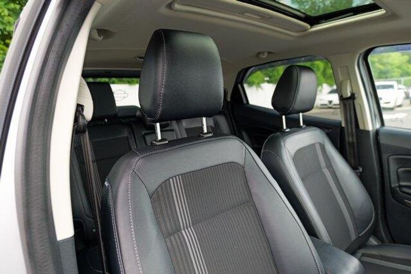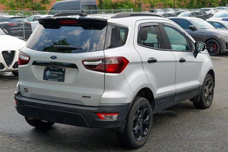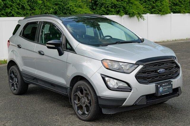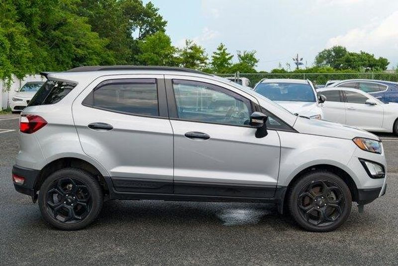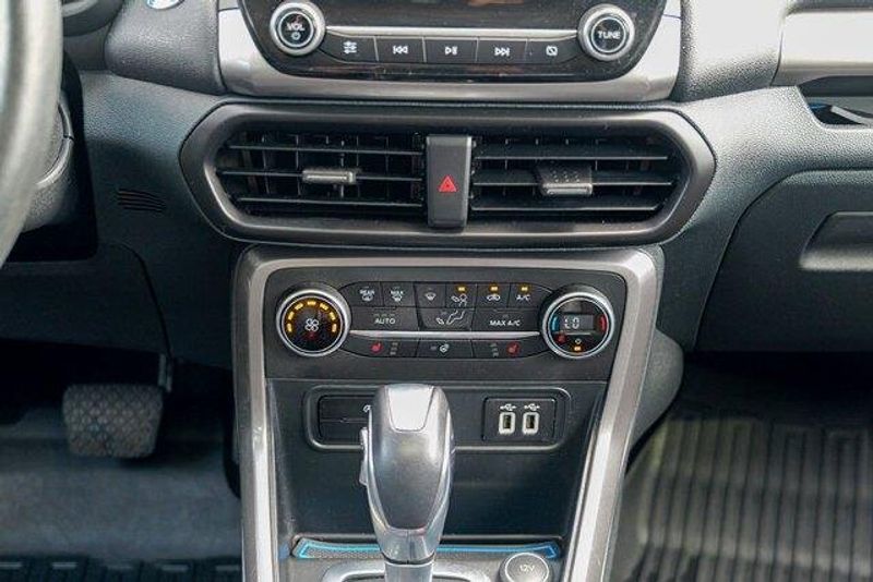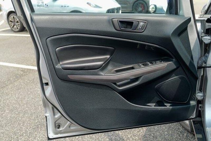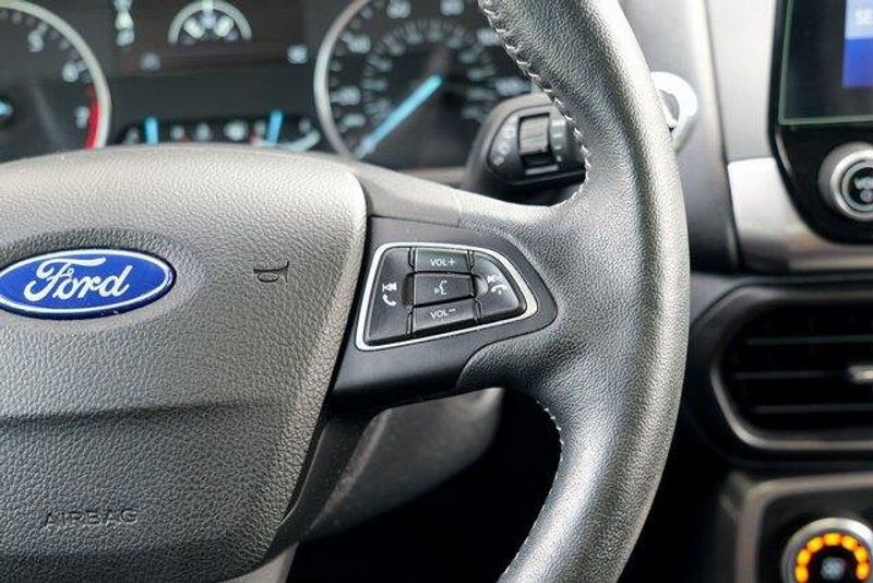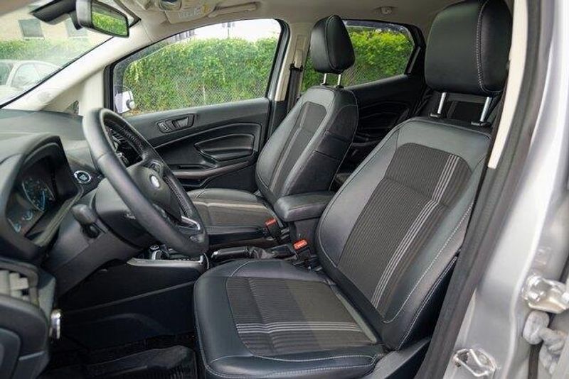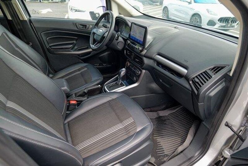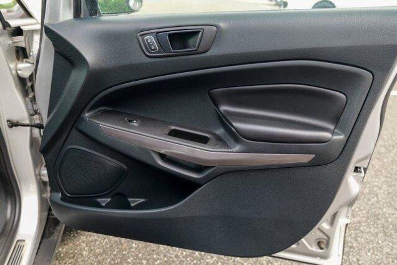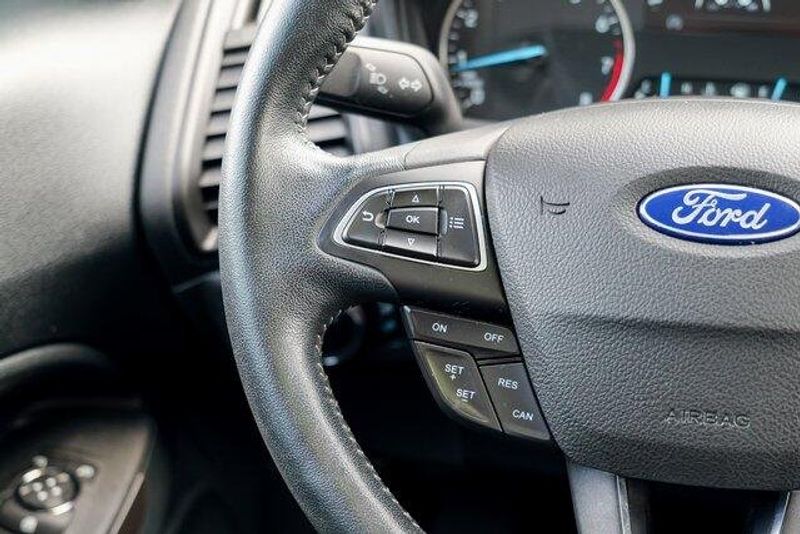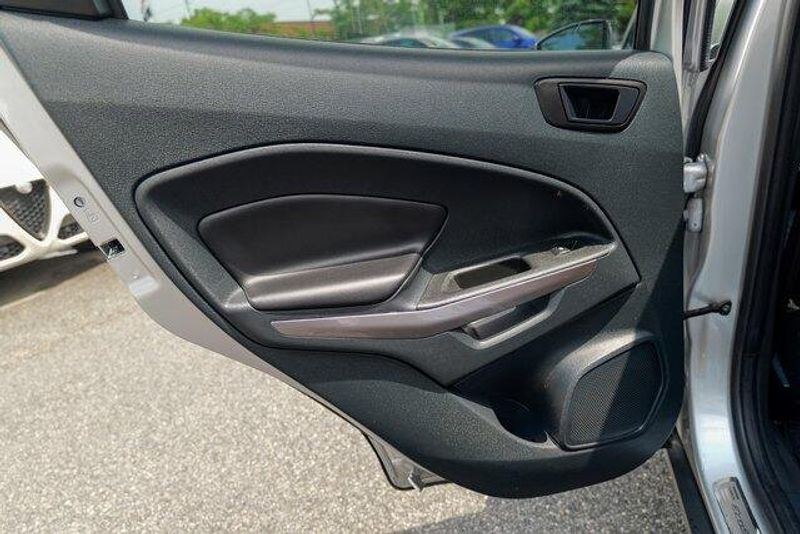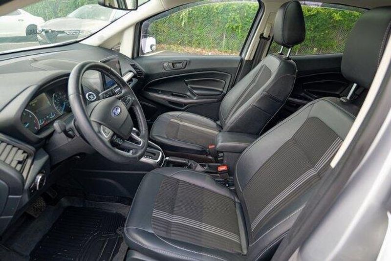 This EcoSport SES is nicely equipped with Equipment Group 300A, 3.51 Axle Ratio, 4-Wheel Disc Brakes, 7 Speakers, ABS brakes, ActiveX Seating Material Heated Front Bucket Seats, Air Conditioning, Alloy wheels, AM/FM radio: SiriusXM, AppLink/Apple CarPlay and Android Auto, Auto-dimming Rear-View mirror, Automatic temperature control, Brake assist, Bumpers: body-color, Compass, Delay-off headlights, Driver door bin, Driver vanity mirror, Dual front impact airbags, Dual front side impact airbags, Electronic Stability Control, Emergency communication system: SYNC 3 911 Assist, Exterior Parking Camera Rear, Front anti-roll bar, Front Bucket Seats, Front Center Armrest, Front fog lights, Front reading lights, Front wheel independent suspension, Fully automatic headlights, Heated door mirrors, Heated front seats, Heated steering wheel, Illuminated entry, Knee airbag, Leather Shift Knob, Low tire pressure warning, Navigation System, Occupant sensing airbag, Outside temperature display, Overhead airbag, Overhead console, Panic alarm, Passenger door bin, Passenger vanity mirror, Power door mirrors, Power driver seat, Power moonroof, Power steering, Power windows, Radio data system, Radio: AM/FM/MP3 Stereo, Rain sensing wipers, Rear anti-roll bar, Rear Parking Sensors, Rear seat center armrest, Rear side impact airbag, Rear window defroster, Rear window wiper, Remote keyless entry, Roof rack: rails only, SiriusXM Radio, SiriusXM Traffic & Travel Link, Speed control, Speed-sensing steering, Split folding rear seat, Spoiler, Steering wheel mounted audio controls, SYNC 3 Communications & Entertainment System, Tachometer, Telescoping steering wheel, Tilt steering wheel, Traction control, Trip computer, Turn signal indicator mirrors, Variably intermittent wipers, and Wheels: 17'' Black-Painted Aluminum.