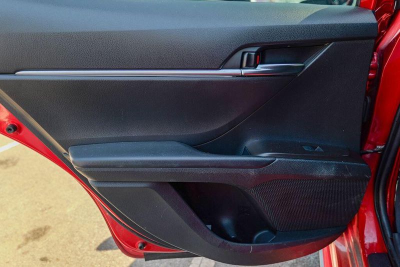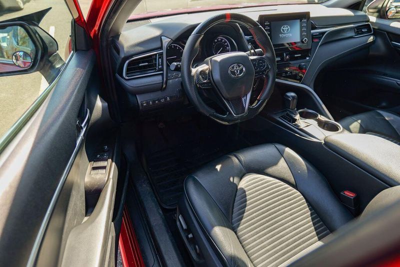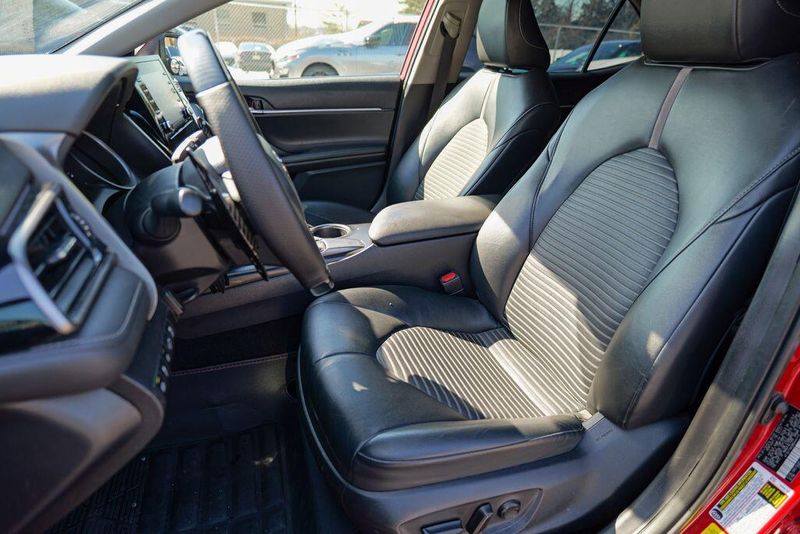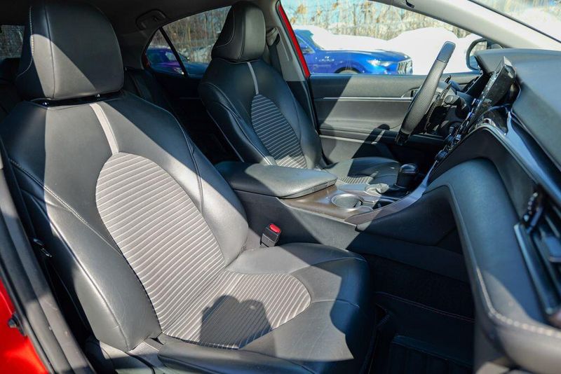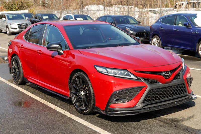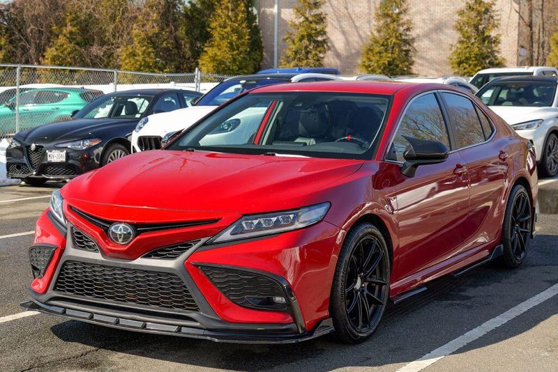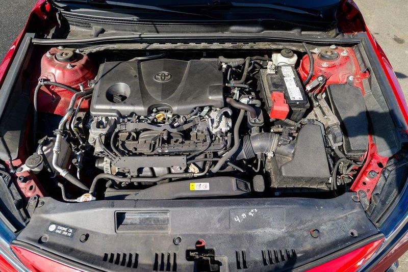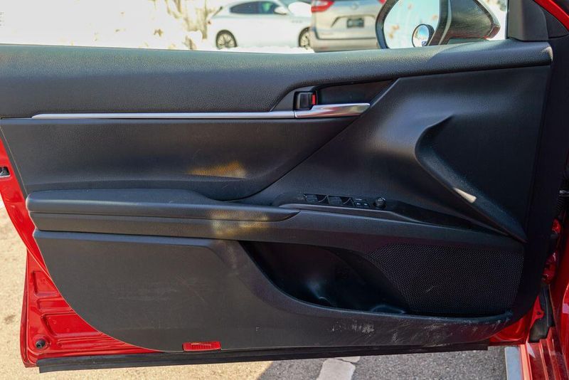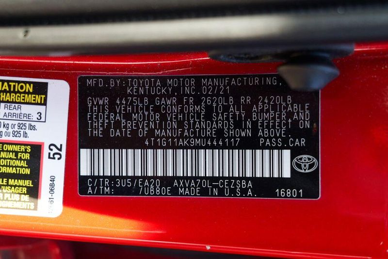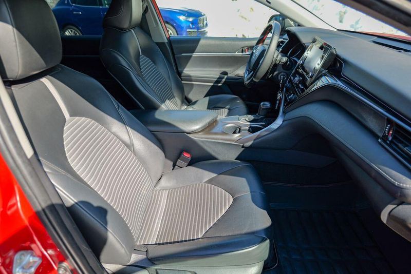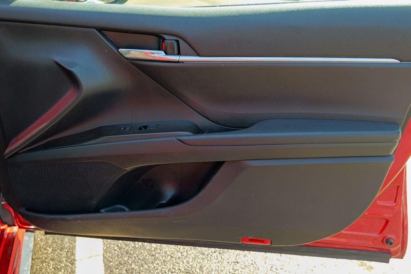 2021 Toyota Camry SE Nightshade Supersonic Red Camry SE Nightshade, 4D Sedan, 2.5L I4 DOHC 16V, 8-Speed Automatic, FWD, Supersonic Red, Black Cloth, 6 Speakers, Air Conditioning, Apple CarPlay/Android Auto, Auto High-beam Headlights, Automatic temperature control, Brake assist, Emergency communication system: Safety Connect with 1-year trial, Exterior Parking Camera Rear, Fully automatic headlights, Power door mirrors, Power driver seat, Radio: AM/FM Audio System, Remote keyless entry, Speed control, Speed-sensing steering, Spoiler, Steering wheel mounted audio controls, Wheels: 8.0J x 18'' Black-Painted Alloy.