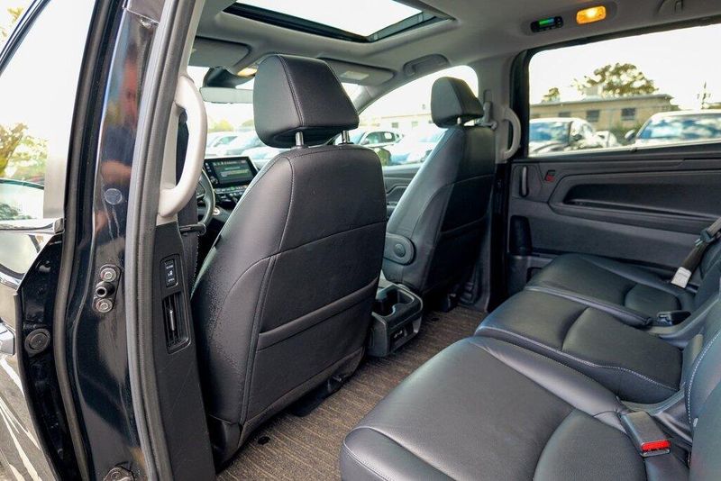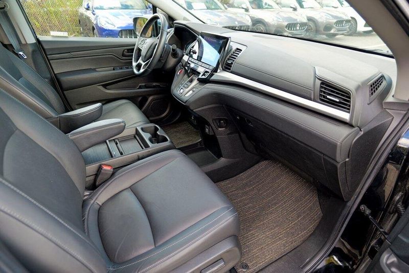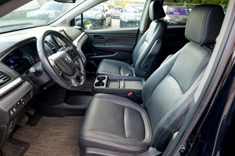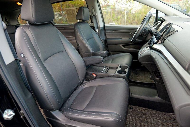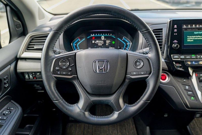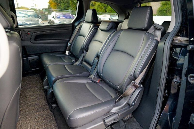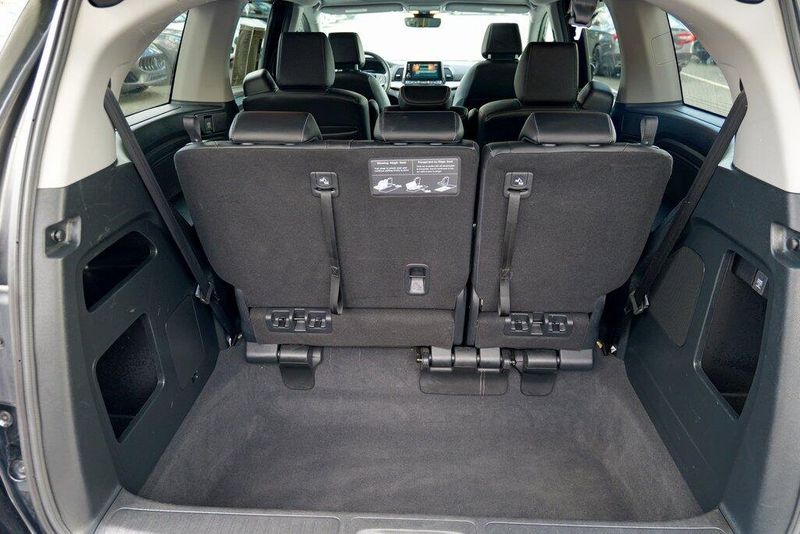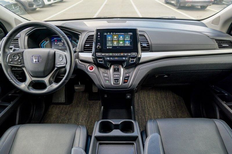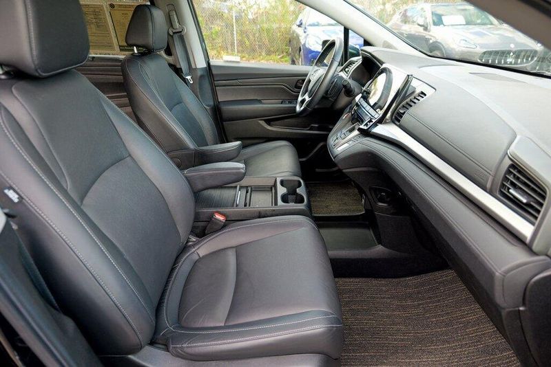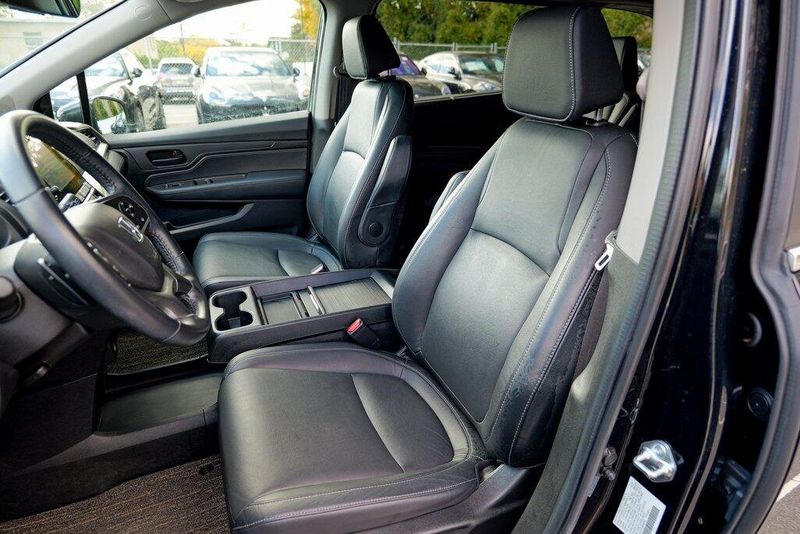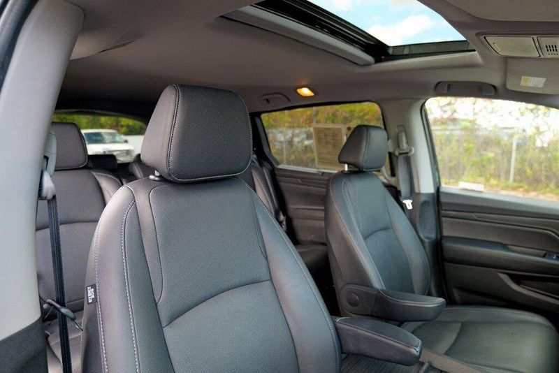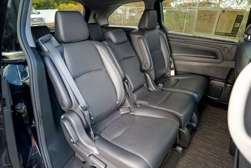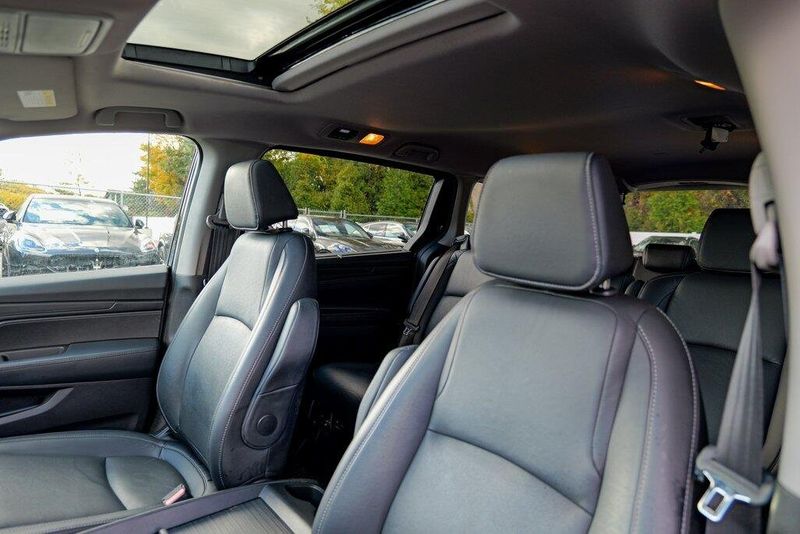 This Odyssey EX-L is nicely equipped with 18'' Machine-Finished Alloy Wheels, 3.61 Axle Ratio, 3rd row seats: split-bench, 4-Wheel Disc Brakes, 7 Speakers, A/V remote: CabinControl, ABS brakes, Adaptive Cruise Control: Adaptive Cruise Control (ACC) with Low-Speed Follow, Air Conditioning, Alloy wheels, AM/FM radio: SiriusXM, Anti-whiplash front head restraints, Apple CarPlay/Android Auto, Auto High-beam Headlights, Auto-dimming Rear-View mirror, Automatic temperature control, Blind Spot Information (BSI) System warning, Brake assist, Bumpers: body-color, Delay-off headlights, Driver door bin, Driver vanity mirror, Driver's Seat Mounted Armrest, Dual front impact airbags, Dual front side impact airbags, Electronic Stability Control, Exterior Parking Camera Rear, Forward collision: Collision Mitigation Braking System (CMBS) + FCW mitigation, Four wheel independent suspension, Front anti-roll bar, Front Bucket Seats, Front dual zone A/C, Front fog lights, Front reading lights, Fully automatic headlights, Garage door transmitter: HomeLink, Heated door mirrors, Heated Front Bucket Seats, Heated front seats, Illuminated entry, Knee airbag, Lane departure: Lane Keeping Assist System (LKAS) active, Leather Seat Trim, Leather steering wheel, Low tire pressure warning, Memory seat, Occupant sensing airbag, Outside temperature display, Overhead airbag, Overhead console, Panic alarm, Passenger door bin, Passenger seat mounted armrest, Passenger vanity mirror, Power door mirrors, Power driver seat, Power Liftgate, Power moonroof, Power passenger seat, Power steering, Power windows, Radio data system, Radio: 160-Watt AM/FM/HD/SiriusXM Audio System, Rear air conditioning, Rear anti-roll bar, Rear reading lights, Rear seat center armrest, Rear window defroster, Rear window wiper, Reclining 3rd row seat, Remote keyless entry, Security system, Speed control, Speed-sensing steering, Speed-Sensitive Wipers, Split folding rear seat, Spoiler, Steering wheel mounted audio controls, Tachometer, Telescoping steering wheel, Tilt steering wheel, Traction control, Trip computer, Turn signal indicator mirrors, and Variably intermittent wipers.