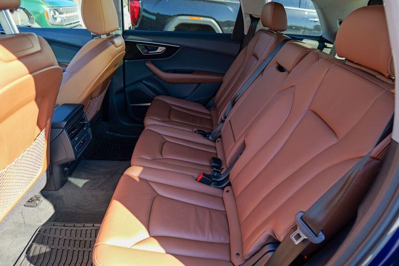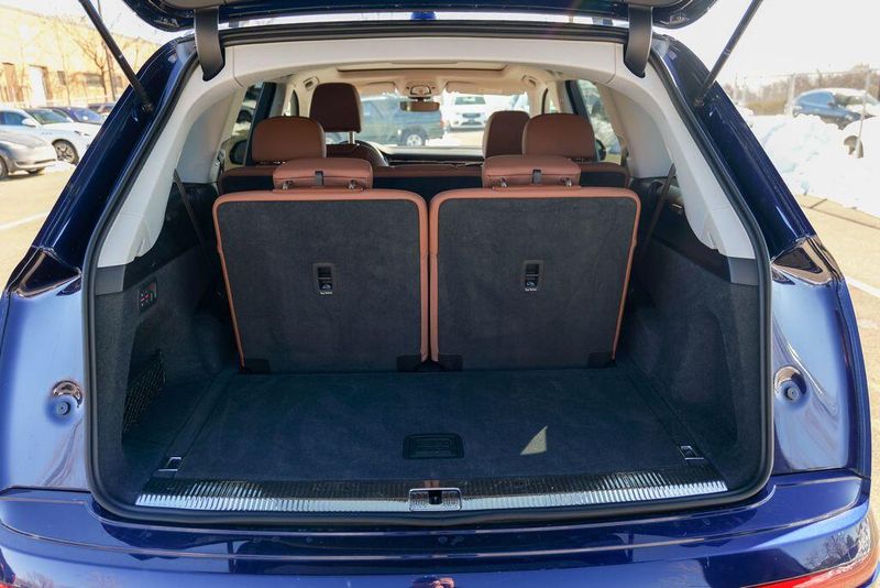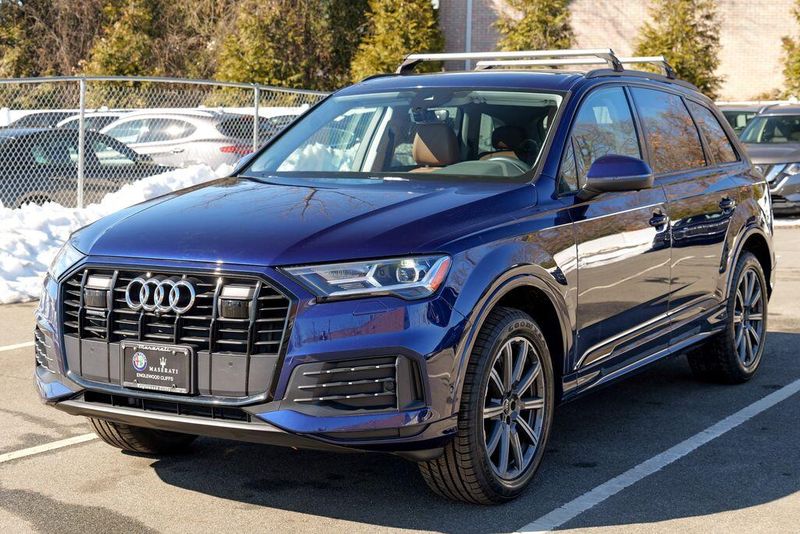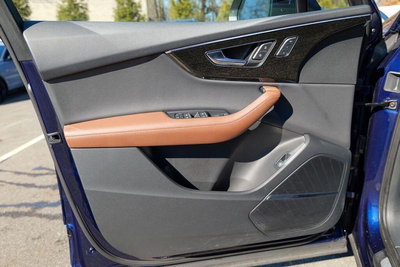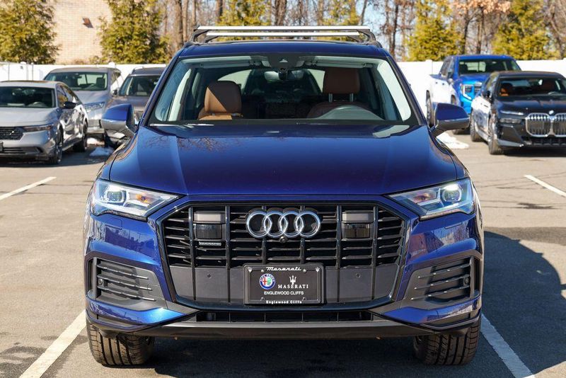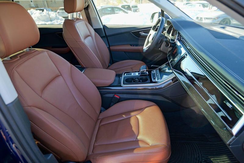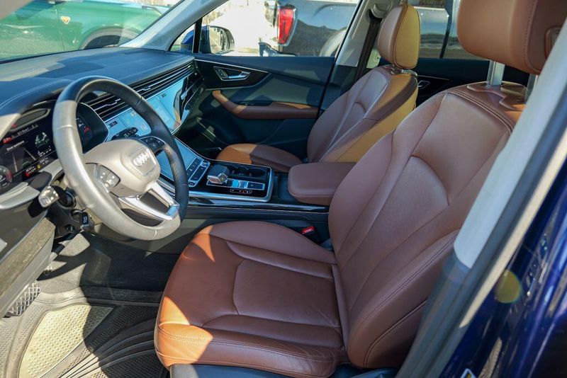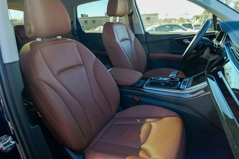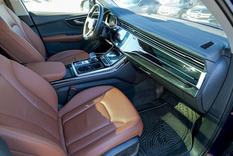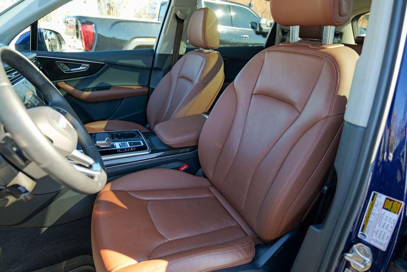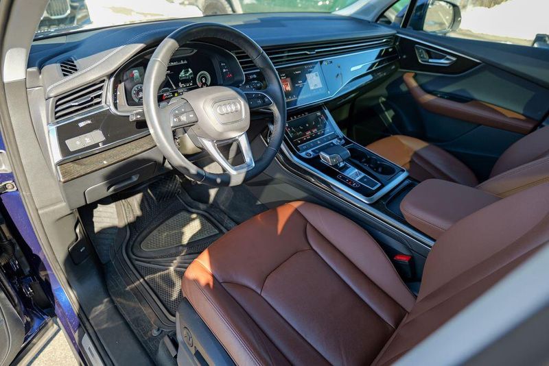 2023 Audi Q7 45 Premium Plus quattro Navarra Blue Metallic Q7 45 Premium Plus quattro, 4D Sport Utility, 2.0L 4-Cylinder TFSI, 8-Speed Automatic with Tiptronic, quattro, Navarra Blue Metallic, Brown Leather, 10 Speakers, 3rd row seats: bench, AM/FM radio: SiriusXM w/ 360L, Auto High-beam Headlights, Automatic temperature control, Bang & Olufsen Premium Sound System w/3D Sound, Black Grille, Black Optic Package, Black Window Surrounds, Brake assist, Convenience Package, Exterior Parking Camera Rear, Four wheel independent suspension, Front dual zone A/C, Fully automatic headlights, Garage door transmitter: HomeLink, Genuine wood door panel insert, Heated Front Bucket Seats, Illuminated Door Sills, Leather Seating Surfaces, Matrix-Design LED Headlights w/DRL Signature, Memory seat, Navigation system: Audi MMI Navigation plus with Touch Response, Power Liftgate, Power moonroof: Panoramic, Power passenger seat, Premium Plus Package, Radio data system, Radio: Audi Sound System, Rain sensing wipers, Rear air conditioning, Reclining 3rd row seat, Remote keyless entry, Speed control, Speed-sensing steering, Steering wheel memory, Steering wheel mounted audio controls, Turn signal indicator mirrors, Wheels: 20'' 10-Spoke-Star Design.