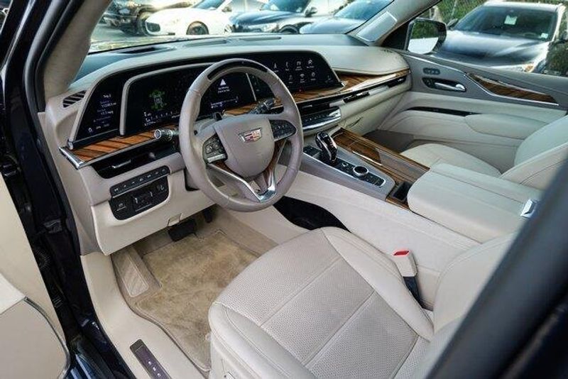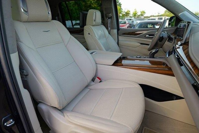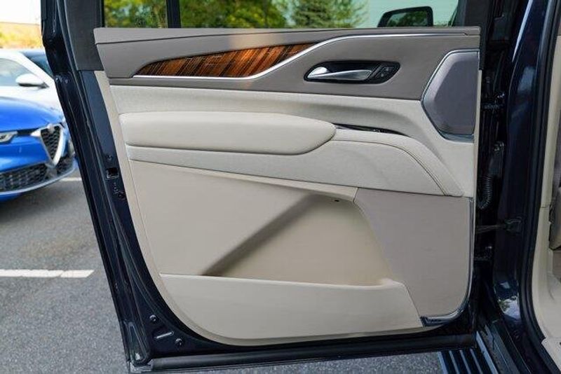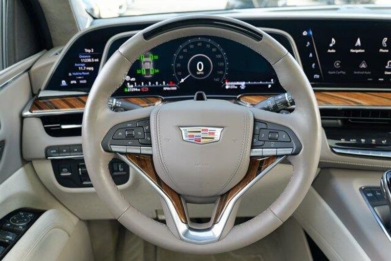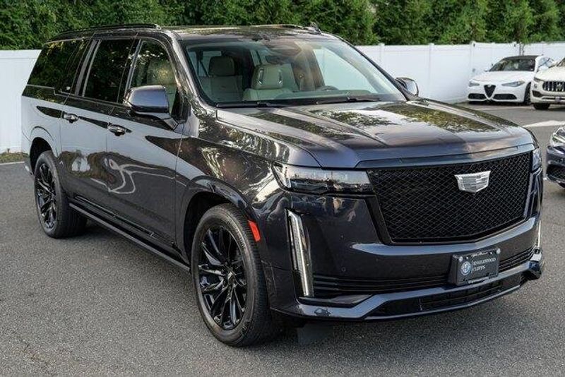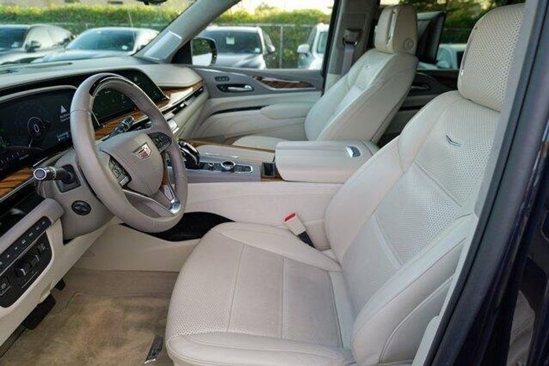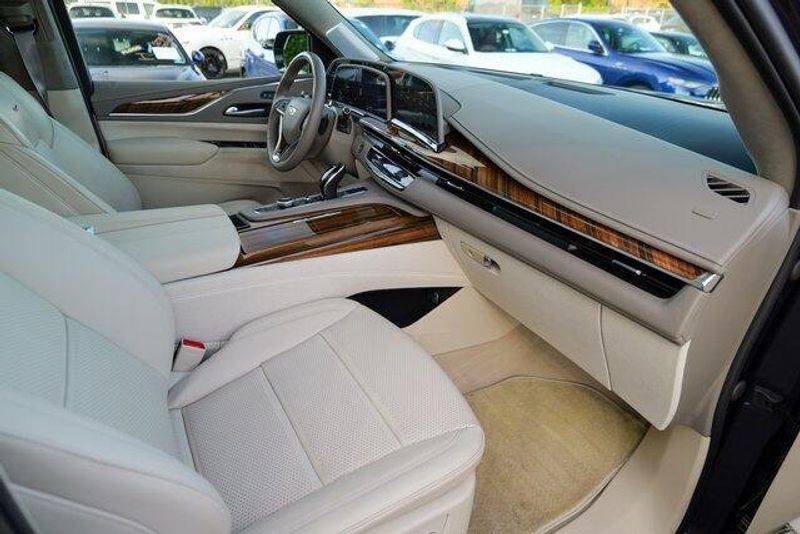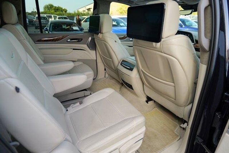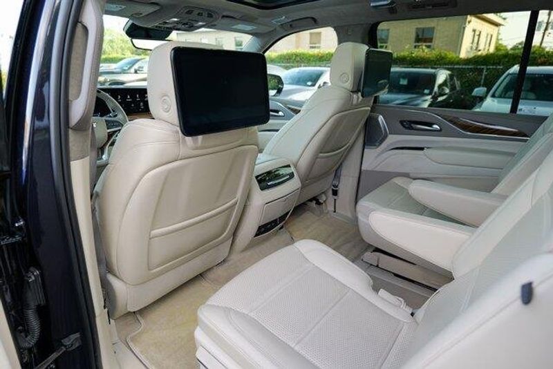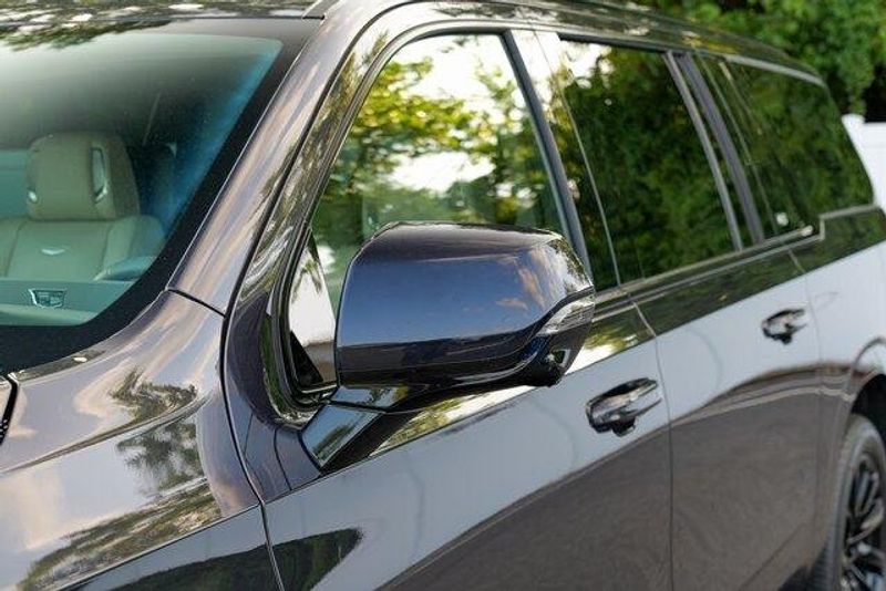 This Escalade ESV Sport Platinum is nicely equipped with Onyx Package (LPO) (Gloss Black Escalade Nameplate (LPO), Monochrome Cadillac Emblems (LPO), Wheels: 22'' 12-Spoke Gloss Black Alloy (LPO), and Wheels: 22'' Interim (LPO)), Preferred Equipment Group 1SH (Adaptive Cruise Control, AKG Studio Reference 36-Speaker Audio System, Automatic Seat Belt Tightening, Body-Color Door Handles, Door Lock & Latch Shields, Electronic Limited-Slip Differential, Enhanced Automatic Emergency Braking, Enhanced Automatic Parking Assist, Floor Console w/Covered Storage, Front Auxiliary 12-volt Power Outlet, Glass Breakage Sensor, Heated & Ventilated Driver & Front Passenger Seats, Hitch Guidance w/Hitch View, Integrated Trailer Brake Controller, Platinum Interior Trim, Power Lumbar Massage Driver Seat, Power Lumbar Massage Front Passenger Seat, Power Panoramic Tilt-Sliding Sunroof, Rear Camera Mirror, Rear Camera Mirror Washer, Rear Cross Traffic Alert, Rear Seat Entertainment System, Reconfigurable Full-Color Head-Up Display, Reverse Automatic Braking, Running Board Assist Steps, Smart Trailer Integration Indicator, Theft-Deterrent Alarm System, Trailer Side Blind Zone Alert, Vehicle Inclination Sensor, and Vehicle Interior Movement Sensor), Touring Package (Air Ride Adaptive Suspension, Illuminating Front & Rear Sill Plates, and Soft Closing Front & Rear Doors), AWD, 16.9'' Diagonal OLED Infotainment Screen, 2-Presets Memory For Driver Seat Adjuster, 3 Years of OnStar & Connected Services Plan, 3.23 Axle Ratio, 3rd row seats: split-bench, 4-Way Power Driver Lumbar Seat Adjuster, 4-Way Power Front Passenger Lumbar Seat Adjuster, 4-Wheel Disc Brakes, 8-Way Power Driver Seat Adjuster, 8-Way Power Front Passenger Seat Adjuster, A/V remote, ABS brakes, Adaptive suspension, Air Conditioning, Alloy wheels, AM/FM radio: SiriusXM with 360L, Apple CarPlay/Android Auto, Audio memory, Auto High-beam Headlights, Auto tilt-away steering wheel, Auto-dimming door mirrors, Automatic temperature control, Brake assist, Bumpers: body-color, Compass, Cooled Console w/Covered Storage, Delay-off headlights, Door auto-latch, Driver door bin, Driver vanity mirror, Dual front impact airbags, Dual front side impact airbags, Electronic Stability Control, Emergency communication system: OnStar and Cadillac connected services capable, Exterior Parking Camera Rear, Four wheel independent suspension, Front anti-roll bar, Front Bucket Seats, Front Center Armrest w/Storage, Front dual zone A/C, Front License Plate Bracket, Front reading lights, Full Semi-Aniline Leather Seat Trim, Fully automatic headlights, Garage door transmitter, Genuine wood console insert, Genuine wood dashboard insert, Genuine wood door panel insert, HD Radio, Headphones, Heads-Up Display, Heated door mirrors, Heated Driver & Front Passenger Seats, Heated front seats, Heated rear seats, Heated steering wheel, Illuminated entry, Leather steering wheel, Low tire pressure warning, Magnetic Ride Control Suspension, Memory seat, Navigation System, Not Equipped w/2nd Row Express-Up Window Control, Occupant sensing airbag, Outside temperature display, Overhead airbag, Overhead console, Panic alarm, Passenger door bin, Passenger vanity mirror, Power door mirrors, Power driver seat, Power Liftgate, Power moonroof, Power passenger seat, Power steering, Power windows, Power-Retractable Assist Steps, Premium Carpeted Floor Mats, Radio data system, Radio: AM/FM w/Navigation, Rain sensing wipers, Rear air conditioning, Rear anti-roll bar, Rear audio controls, Rear reading lights, Rear window defroster, Rear window wiper, Remote keyless entry, Security system, SiriusXM w/360L, Speed control, Split folding rear seat, Spoiler, Steering wheel memory, Steering wheel mounted audio controls, Super Cruise, Tachometer, Teen Driver, Telescoping steering wheel, Tilt steering wheel, Traction control, Trip computer, Turn signal indicator mirrors, Variab