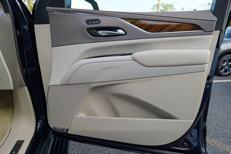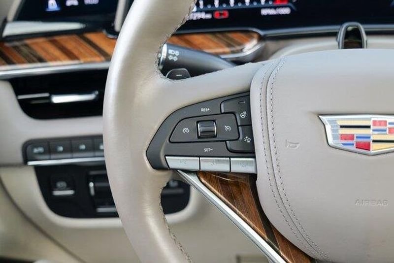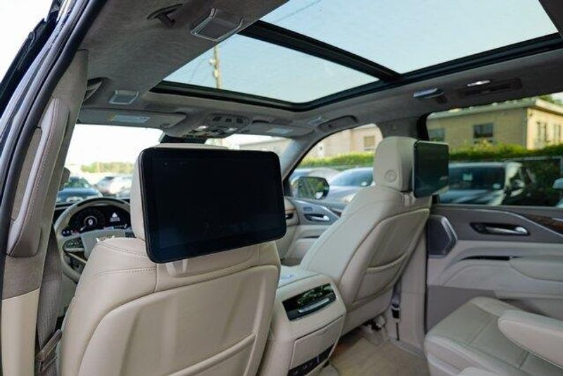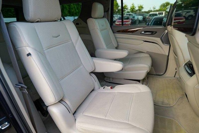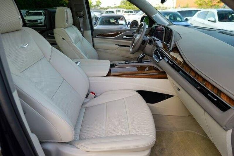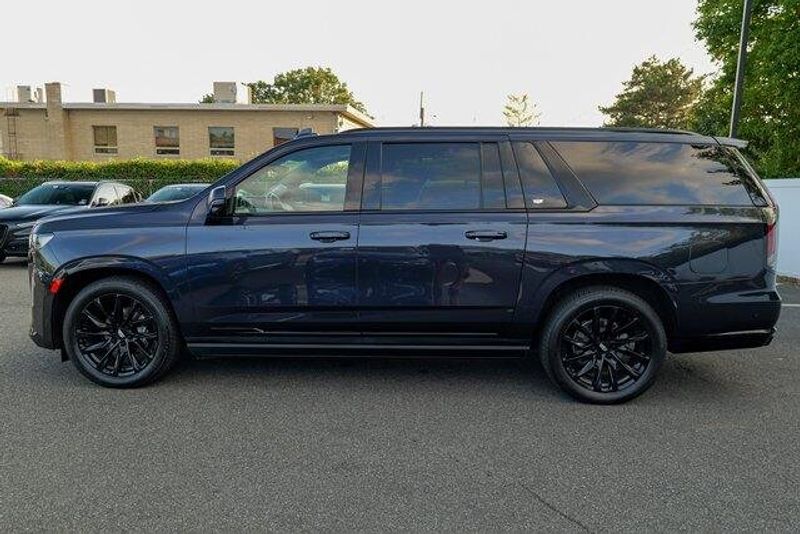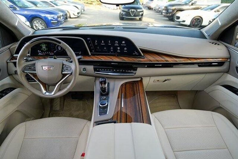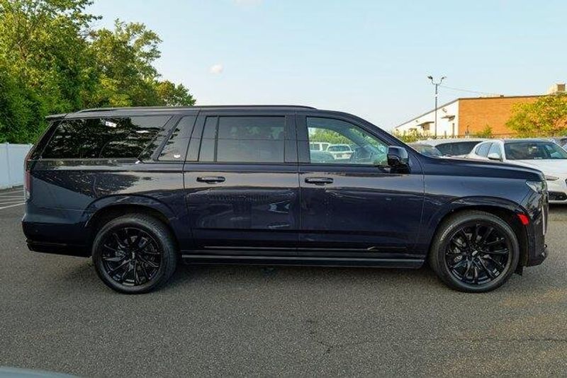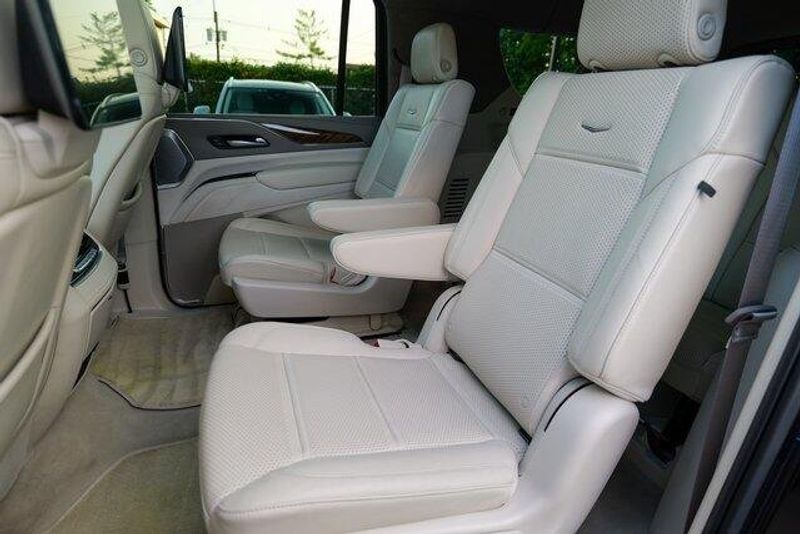 This Escalade ESV Sport Platinum is nicely equipped with Onyx Package (LPO) (Gloss Black Escalade Nameplate (LPO), Monochrome Cadillac Emblems (LPO), Wheels: 22'' 12-Spoke Gloss Black Alloy (LPO), and Wheels: 22'' Interim (LPO)), Preferred Equipment Group 1SH (Adaptive Cruise Control, AKG Studio Reference 36-Speaker Audio System, Automatic Seat Belt Tightening, Body-Color Door Handles, Door Lock & Latch Shields, Electronic Limited-Slip Differential, Enhanced Automatic Emergency Braking, Enhanced Automatic Parking Assist, Floor Console w/Covered Storage, Front Auxiliary 12-volt Power Outlet, Glass Breakage Sensor, Heated & Ventilated Driver & Front Passenger Seats, Hitch Guidance w/Hitch View, Integrated Trailer Brake Controller, Platinum Interior Trim, Power Lumbar Massage Driver Seat, Power Lumbar Massage Front Passenger Seat, Power Panoramic Tilt-Sliding Sunroof, Rear Camera Mirror, Rear Camera Mirror Washer, Rear Cross Traffic Alert, Rear Seat Entertainment System, Reconfigurable Full-Color Head-Up Display, Reverse Automatic Braking, Running Board Assist Steps, Smart Trailer Integration Indicator, Theft-Deterrent Alarm System, Trailer Side Blind Zone Alert, Vehicle Inclination Sensor, and Vehicle Interior Movement Sensor), Touring Package (Air Ride Adaptive Suspension, Illuminating Front & Rear Sill Plates, and Soft Closing Front & Rear Doors), AWD, 16.9'' Diagonal OLED Infotainment Screen, 2-Presets Memory For Driver Seat Adjuster, 3 Years of OnStar & Connected Services Plan, 3.23 Axle Ratio, 3rd row seats: split-bench, 4-Way Power Driver Lumbar Seat Adjuster, 4-Way Power Front Passenger Lumbar Seat Adjuster, 4-Wheel Disc Brakes, 8-Way Power Driver Seat Adjuster, 8-Way Power Front Passenger Seat Adjuster, A/V remote, ABS brakes, Adaptive suspension, Air Conditioning, Alloy wheels, AM/FM radio: SiriusXM with 360L, Apple CarPlay/Android Auto, Audio memory, Auto High-beam Headlights, Auto tilt-away steering wheel, Auto-dimming door mirrors, Automatic temperature control, Brake assist, Bumpers: body-color, Compass, Cooled Console w/Covered Storage, Delay-off headlights, Door auto-latch, Driver door bin, Driver vanity mirror, Dual front impact airbags, Dual front side impact airbags, Electronic Stability Control, Emergency communication system: OnStar and Cadillac connected services capable, Exterior Parking Camera Rear, Four wheel independent suspension, Front anti-roll bar, Front Bucket Seats, Front Center Armrest w/Storage, Front dual zone A/C, Front License Plate Bracket, Front reading lights, Full Semi-Aniline Leather Seat Trim, Fully automatic headlights, Garage door transmitter, Genuine wood console insert, Genuine wood dashboard insert, Genuine wood door panel insert, HD Radio, Headphones, Heads-Up Display, Heated door mirrors, Heated Driver & Front Passenger Seats, Heated front seats, Heated rear seats, Heated steering wheel, Illuminated entry, Leather steering wheel, Low tire pressure warning, Magnetic Ride Control Suspension, Memory seat, Navigation System, Not Equipped w/2nd Row Express-Up Window Control, Occupant sensing airbag, Outside temperature display, Overhead airbag, Overhead console, Panic alarm, Passenger door bin, Passenger vanity mirror, Power door mirrors, Power driver seat, Power Liftgate, Power moonroof, Power passenger seat, Power steering, Power windows, Power-Retractable Assist Steps, Premium Carpeted Floor Mats, Radio data system, Radio: AM/FM w/Navigation, Rain sensing wipers, Rear air conditioning, Rear anti-roll bar, Rear audio controls, Rear reading lights, Rear window defroster, Rear window wiper, Remote keyless entry, Security system, SiriusXM w/360L, Speed control, Split folding rear seat, Spoiler, Steering wheel memory, Steering wheel mounted audio controls, Super Cruise, Tachometer, Teen Driver, Telescoping steering wheel, Tilt steering wheel, Traction control, Trip computer, Turn signal indicator mirrors, Variab