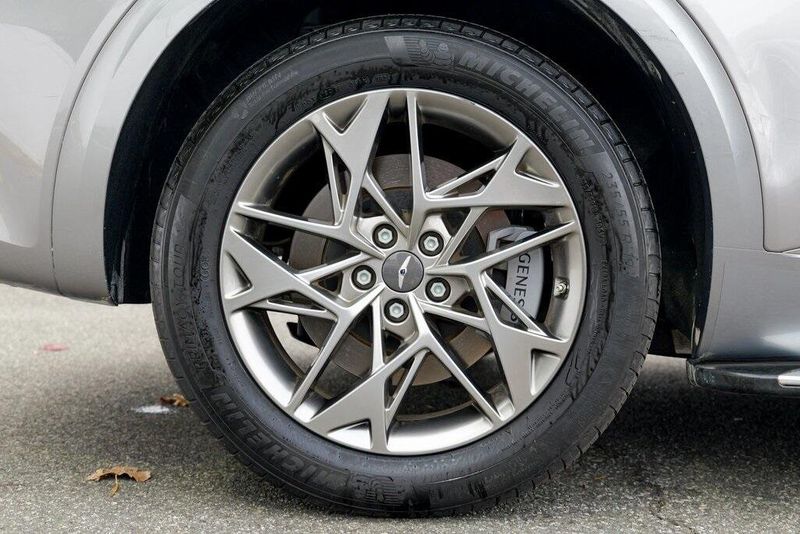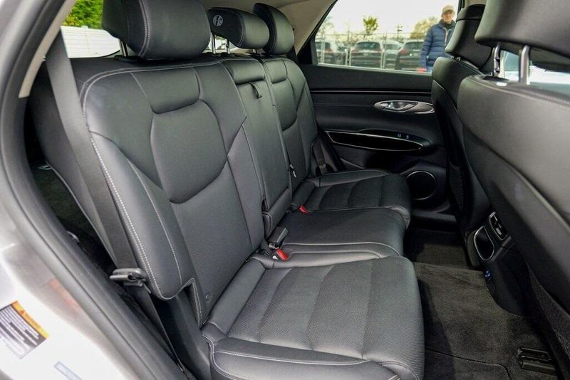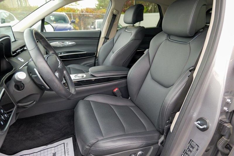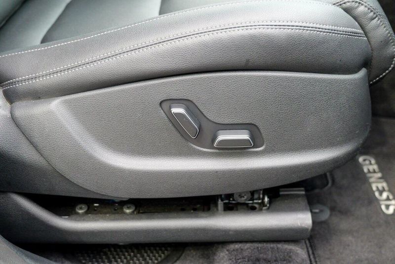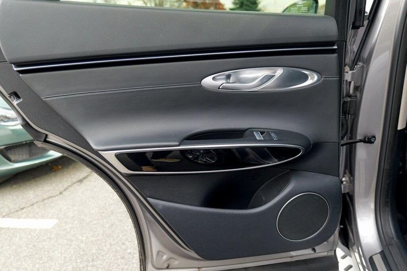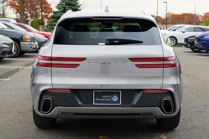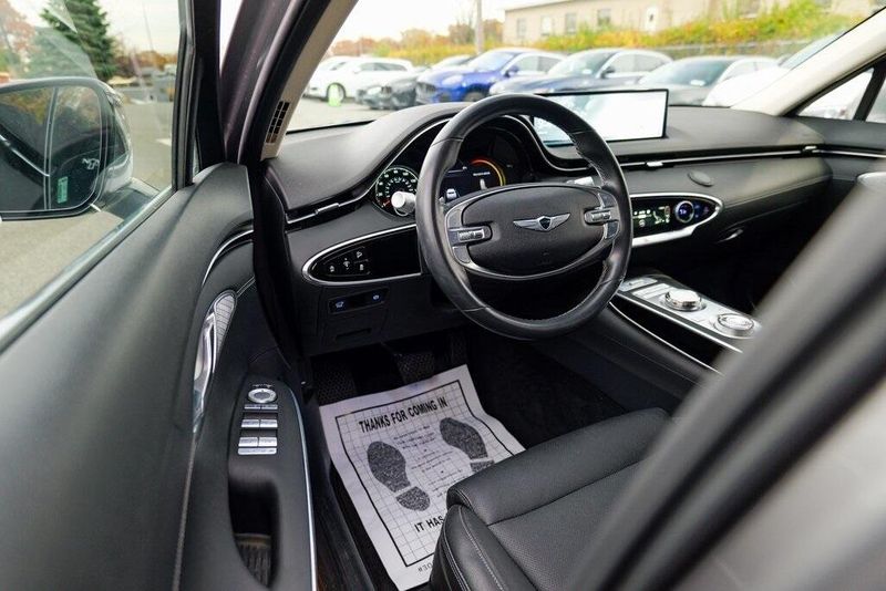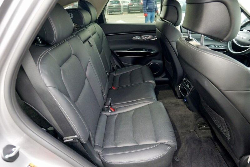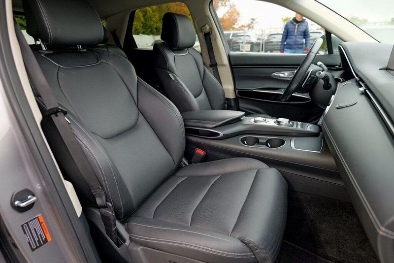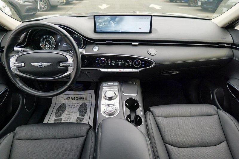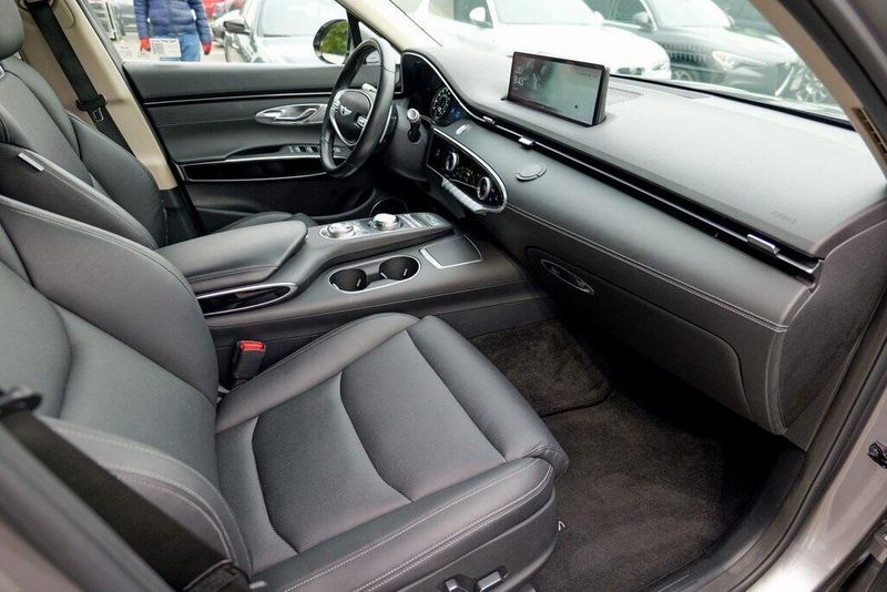 This GV70 2.5T is nicely equipped with GV70 2.5T, 4D Sport Utility, 2.5L DOHC, 8-Speed Automatic with SHIFTRONIC, AWD, Savile Silver, Black/Black Artificial Leather, 4-Wheel Disc Brakes, 9 Speakers, ABS brakes, Air Conditioning, Alloy wheels, AM/FM radio: SiriusXM, Android Auto & Apple CarPlay, Anti-whiplash front head restraints, Auto High-beam Headlights, Auto-dimming Rear-View mirror, Automatic temperature control, Brake assist, Bumpers: body-color, Delay-off headlights, Driver door bin, Driver vanity mirror, Dual front impact airbags, Dual front side impact airbags, Electronic Stability Control, Emergency communication system: Genesis Connected Services, Exterior Parking Camera Rear, Four wheel independent suspension, Front anti-roll bar, Front Bucket Seats, Front Center Armrest w/Storage, Front dual zone A/C, Front reading lights, Fully automatic headlights, Garage door transmitter: HomeLink, Heated door mirrors, Heated Front Bucket Seats, Heated front seats, Illuminated entry, Knee airbag, Leather steering wheel, Leatherette Seating Surfaces, Low tire pressure warning, Navigation System, Occupant sensing airbag, Outside temperature display, Overhead airbag, Overhead console, Panic alarm, Passenger door bin, Passenger vanity mirror, Power door mirrors, Power driver seat, Power Liftgate, Power passenger seat, Power steering, Power windows, Radio: 14.5'' Navigation System w/AM/FM/HD Radio, Rain sensing wipers, Rear anti-roll bar, Rear Parking Sensors, Rear reading lights, Rear seat center armrest, Rear window defroster, Rear window wiper, Remote keyless entry, Security system, Speed control, Speed-sensing steering, Speed-Sensitive Wipers, Split folding rear seat, Spoiler, Steering wheel mounted audio controls, Tachometer, Telescoping steering wheel, Traction control, Trip computer, Turn signal indicator mirrors, Variably intermittent wipers, and Wheels: 19'' Dark Hyper Silver Alloy.