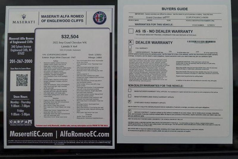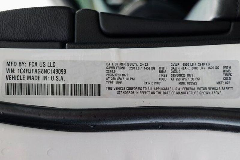 2022 Jeep Grand Cherokee WK Laredo X Bright White Clearcoat Grand Cherokee WK Laredo X, 4D Sport Utility, 3.6L V6 24V VVT, 8-Speed Automatic, 4WD, Bright White Clearcoat, Black Leather, 115V Auxiliary Power Outlet, Altitude Appearance Package, Altitude Grille, Apple CarPlay/Android Auto, Black Suede Seats w/Black Stitching, Body Color Claddings, Body Color Fascia, Body Color Shark Fin Antenna, Dark Day Light Opening Moldings, Dark Headlamp Bezel Finish, Dark Lens Taillamps, Delete Laredo Badge, Front Accent/Body Color Fascia, Gloss Black Jeep Badging, Gloss Black Rear Fascia Applique, Heated Front Seats, Heated Steering Wheel, Hill Descent Control, Navigation System, ParkView Rear Back-Up Camera, Power Liftgate, Quadra-Trac II 4WD System, Quick Order Package 2GM Laredo X (DISC), Radio: Uconnect 4C Nav w/8.4'' Display, Rear Accent/Body Color Fascia, Rear Fascia Black Molded in Color Step Pad, Remote Start System, Security Alarm, Selec-Terrain System, Single Exhaust w/Bright Tip, Steering Wheel Mounted Audio Controls, Steering wheel mounted audio controls, Universal Garage Door Opener, Wheels: 20'' x 8.0'' Gloss Black Aluminum.